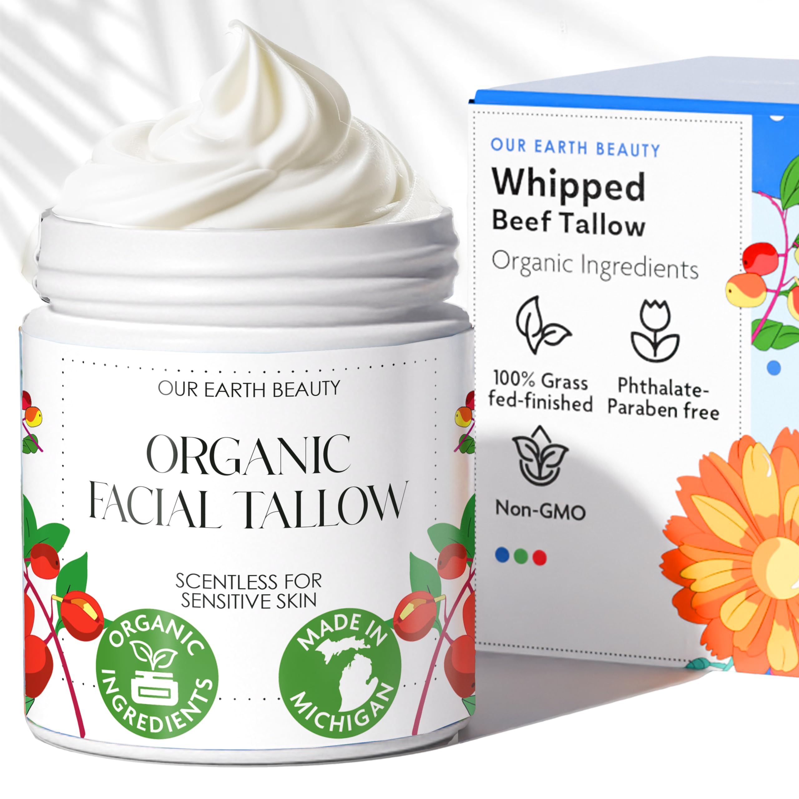 WINTER-PROOF SKIN SUPPORT - Dry from wind, heat, or seasonal stress? This balm shines in cold, dry months. Use it on dry patches, cheeks, or around the nose to help reduce the feeling of cracking, flaking, or stubborn dryness. MADE IN THE USA - Small batches, made in Michigan for maximum freshness. American company started by an American founder. Our GRASS FED GRASS FINISHED beef tallow is RICH in skin loving vitamins A, D, E, K naturally found in only the best beef tallow for skin formulas. Grass fed tallow is known for its balanced fatty acid profile, which many people find gentler on facial skin than grain-fed varieties. Our whipped beef tallow face cream delivers a nutrient-dense moisturizing experience, ideal for nighttime skincare routines to maintain supple, well-conditioned balanced skin. CLEAN. SIMPLE. ORGANIC INGREDIENTS - Meticulously sourced, perfectly balanced. We skipped the shortcuts. Our organically derived completely unscented grass fed grass finished tallow is perfectly paired with the finest USDA organic ingredients: jojoba oil (absorption), almond oil (softness), Shea butter (long lasting hydration), calendula oil (replenish), and moringa oil (soothe) — all chosen for specific benefits, in perfect ratios, and ultimate purity. That's why we're able to keep a light airy feel. GRASS FED BEEF TALLOW FOR FACE, NOT FEET - Unlike other tallow balms that are heavy, greasy, and only acceptable for cracked heels — not delicate facial skin, our whipped grass fed beef tallow is made for your FACE. It's whipped for a light, velvety, fast-absorbing texture that softens and hydrates without the grease. Grain-fed tallow and bulk oils like olive — sometimes blended with seed oils, even in organic formulas — can create a thicker, less absorbent feel on the skin. If you're wondering what makes our tallow so special, read on….