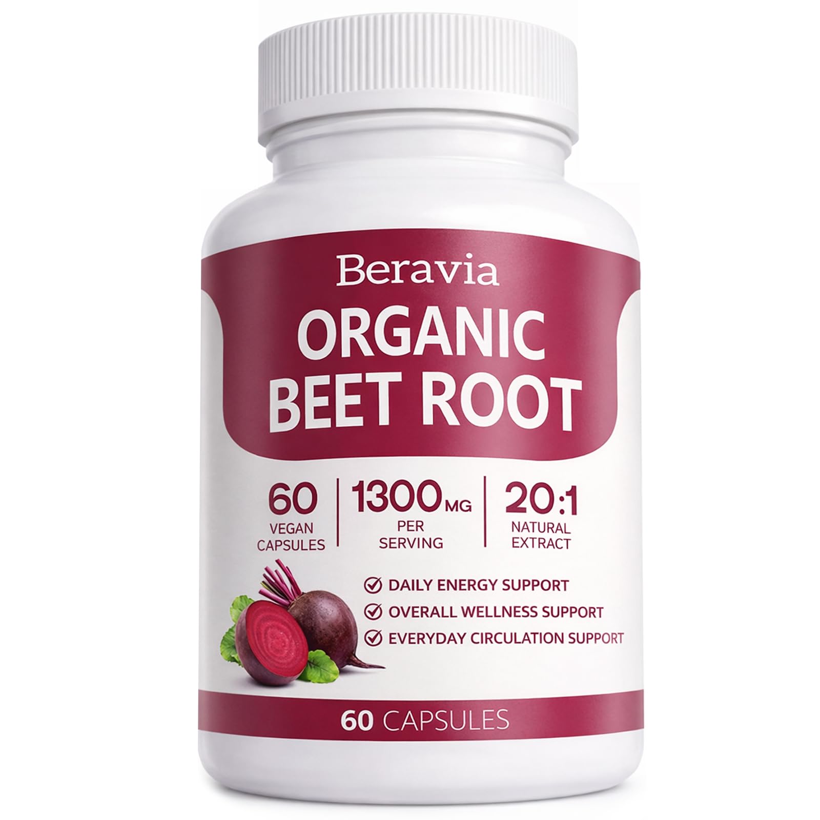 Clean, Plant-Based Everyday Friendly: Made with non-GMO, organic beets and free from gluten, dairy, and soy. Beravia Beetroot are suitable for men and women seeking a clean, plant-based supplement that fits seamlessly into active, everyday routines. Easy-to-Take, No Mess or Taste: Enjoy the benefits of beetroot without juices or powders. These small, easy-to-swallow are taste-free and convenient for home, work, or travel—making daily use simple and hassle-free. Beravia Organic Beet Root with Naturally Occurring Antioxidants: Beetroot contains naturally occurring betalains, iron, and folate, which help support antioxidant activity and protect cells from everyday oxidative stress. A whole-food approach to supporting long-term wellness from within. Beravia Beetroot High-Potency Organic Formula: Beravia Beetroot provide 1300 mg of organic beet root powder per serving, sourced from carefully selected red beets. A concentrated, plant-based option designed to support daily nutrition and overall wellness as part of a balanced lifestyle. Beravia organic beet root capsules Supports Healthy Circulation Daily Vitality: Naturally occurring dietary nitrates in beetroot help support normal blood flow and oxygen delivery, contributing to everyday energy, activity, and overall vitality. Ideal for those looking to maintain circulation support through consistent daily use.