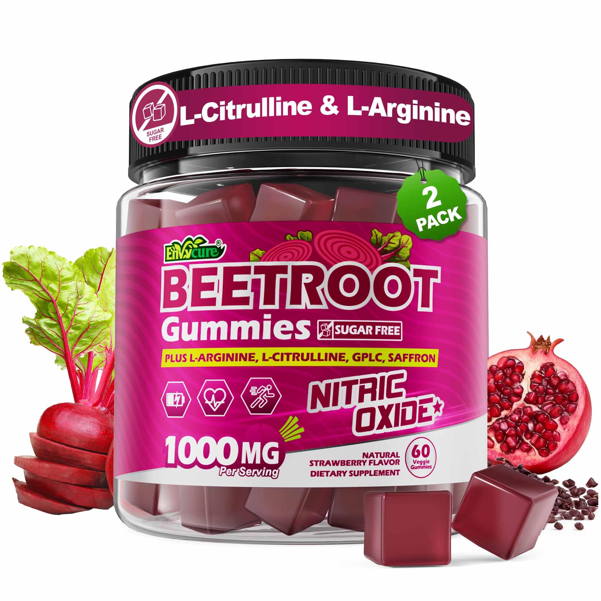EXPERTLY DESIGNED FOR ADULTS QUALITY YOU CAN TRUST: Experience a natural energy boost with just 2 gummies per serving! Envycure beetroot gummies are made with a commitment to purity and potency, using globally sourced ingredients, manufacture in GMP-compliant facilities, and subject every batch to rigorous third-party testing. They're gluten-free, soy-free, wheat yeast-free and non-GMO, nitric oxide supplements for men and women you can trust. Have questions? We're here to help. SUGAR-FREE DELICIOUS BLUEBERRY FLAVOR: With zero sugar, no earthy taste and a naturally refreshing blueberry flavor, Envycure nitric oxide gummies offer an easy and enjoyable way to support your daily v?scul?r health. Just 2 gummies a day can keep you energized. Packed with essential nutrients and easy to take anytime, anywhere, these gummies make your nitric oxide and overall wellness routine effortless. Perfect for busy professionals, athletes, and anyone looking for daily energetic support. POWERFUL ANTIOXIDANT VÂSCULÂR SUPPORT: Powered by a potent blend of grape seed and pomegranate to fight oxidative stress, protect cells, vâsculâr health, immune system, and promote faster recovery after daily activity. A gentle addition of saffron helps support mõõd balance and mentâl focus, keeping you energized hroughout the day, while its natural antioxidant properties further support overall cellular wellness. Enhanced with black pepper extract for improved absorption and stronger results. BOOST NITRIC OXIDE FOR ENHANCED BLÔÔD FLOW: Ready for stronger pümps better training? Our clinically backed Dual Amino N.O. Complex (L-Citrulline Malate L-Arginine AKG) supercharges nitric oxide pathways for next-level performânce. Citrulline supports long-lasting NO, Arginine AKG delivers fast pümp power, GPLC fuels ATP energy, and Beta-Alanine helps delay fâtigue. This advanced formula is built to help you trâin stronger, last longer, better Blõõd flow, and recover better. NUTRIENT-DENSE SUPERFOOD: Beetroot is a naturally nutrient-rich root vegetable packed with essential vitamins, minerals, and plant nutrients. Our beetroot gummies are powered by a highly concentrated 1000mg Organic Beet Root (3:1) Extract — equal to 3000mg of whole root, standardized to 5 natural nitrates for superior nitric oxide production. This supports healthy circulation, oxygen delivery, boosts daily energy, and heârt wellness—making it one of nature's most complete functional superfoods.