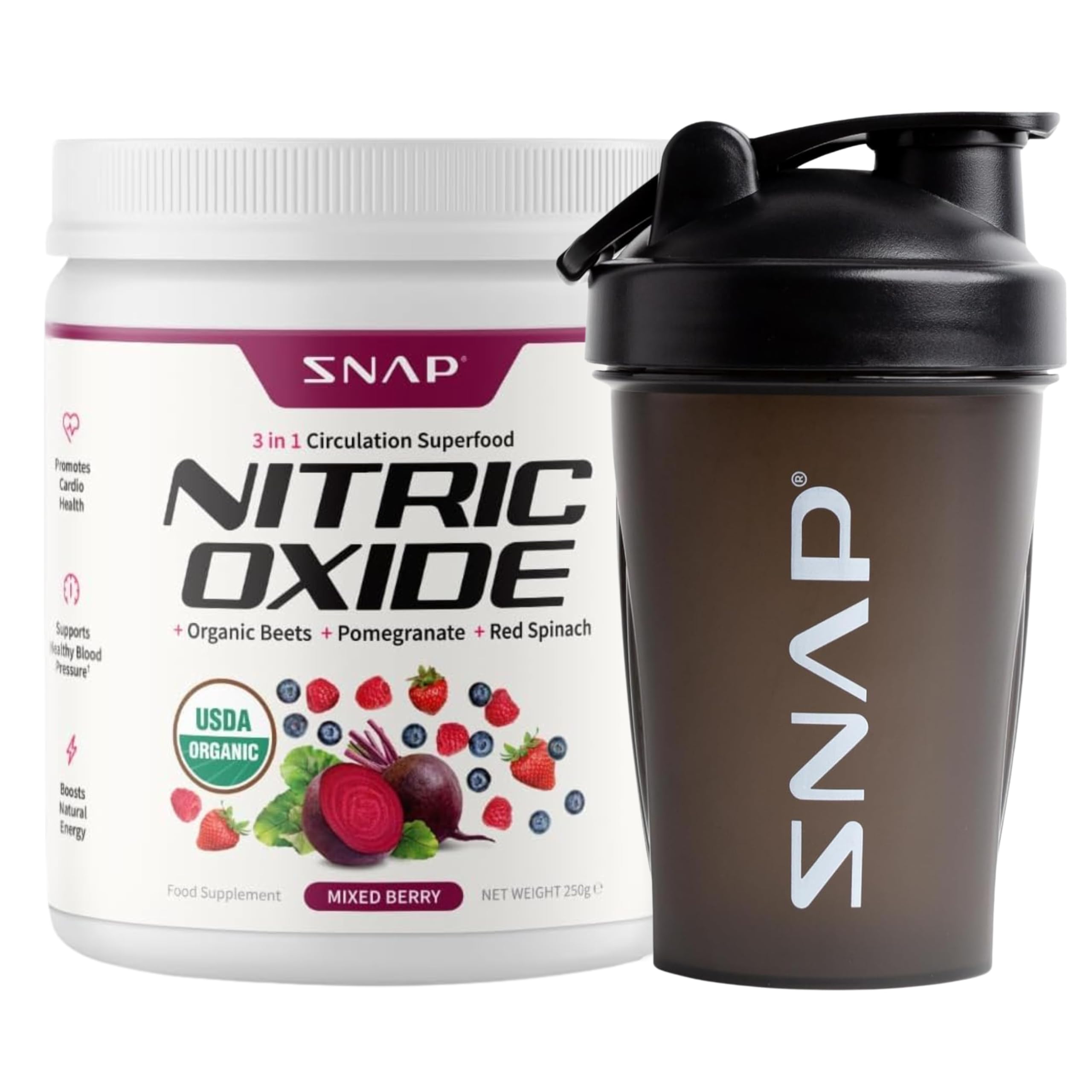 QUALITY YOU CAN TRUST: Snap Supplements delivers quality you can trust. Our vitamins and supplements are crafted by health experts and manufactured in the USA with globally sourced ingredients. Most of our supplements are vegan, plant based, caffeine free, sucralose free, soy free, allergen free, and contain no added sugar. SUPERCHARGE YOUR DIET: This superfood beet powder supplement works to deliver organic superfood nutrients to help elevate your health, enhance your diet, and supercharge your energy levels, keeping you at the top of your game. Simply mix one scoop of the organic beets in 8-12 oz of your favorite beverage and enjoy pre workout, or whenever you need. ANTIOXIDANT PROTECTION: Our nitric oxide beet root supplement includes antioxidant rich ingredients like pomegranate and beetroot — promoting a healthy response to support healthy hearts. NATURAL ENERGY AND PERFORMANCE SUPPORT: Our circulation supplements are packed with essential vitamins, minerals, and phytochemicals, our beet root powder can naturally support your energy, empowering you to tackle your day and crush your workouts. HEALTHY HEART SUPPORT: Maintain peak performance and a healthy lifestyle with Snap Supplements' Beetroot Powder. Our beets supplements formula is packed with nitrate-rich ingredients to promote nitric oxide levels, supporting healthy circulation.