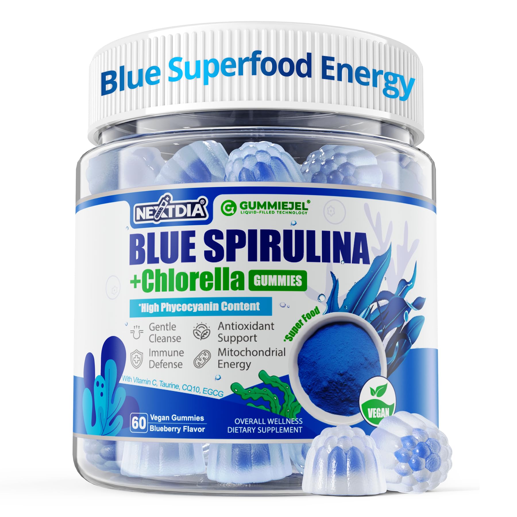 Clean, Vegan Safe: Crafted in cGMP-certified facilities, these gummies are non-GMO, vegan, gluten-free, and dairy-free—free from artificial colors and preservatives. Each batch is third-party tested to ensure purity, potency, and safety, so you can enjoy the health benefits of Blue Spirulina with confidence. Sweet Juice Filled Gummies, Zero Sugar: Say goodbye to bitter spirulina powder and hard-to-swallow pills. These juicy, mixed blueberry-flavored gummies are liquid-filled for a burst of flavor—naturally sweetened with monk fruit extract and completely sugar-free. Superfoods have never tasted so good!. Energy, Antioxidants Cellular Support in Every Gummy: This isn't just a supplement—it's a daily vitality boost. High-phycocyanin blue spirulina works with chlorella to protect cells, CoQ10 and taurine fuel your energy, and vitamin C helps shield your immune system so you can stay strong, focused, and full of life. Power Up with More Than Just Blue Spirulina: Nextdia's Blue Spirulina Gummies are boosted with a superfood synergy—CoQ10, taurine, green tea extract, and chlorella—working as an overall adaptogen for the entire body. They deliver benefits for immune support, natural energy, body odor control, digestion aid, colon health, and more. Every gummy is a nutrient-packed ally for your wellness journey, morning to night. Ocean's Brightest Superfoods – Blue Spirulina Chlorella: Ready to energize and refresh your body with nature's rarest treasures? Our Blue Spirulina Gummies combine high-phycocyanin blue spirulina—famed for its vibrant antioxidants—with chlorella, the det?x green hero. Loaded with vegan protein, chlorophyll, fiber, amino acids (Omega 3-6-9, GLA, Arginine), fatty acids, and immune vitamins, they help cleanse, energize, and protect your body from the inside out.