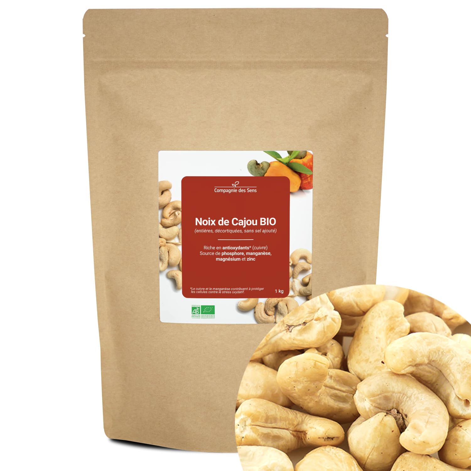 These shelled cashew nuts are certified organic by Ecocert (FR-BIO-01). They are rich in antioxidants (copper) and unsaturated fats, but also a source of manganese, magnesium, phosphorus and zinc. They can be eaten as is, roasted or crushed. It is also possible to eat them alone or mixed with other dried fruits. These cashew nuts are sold in an airtight bag to preserve all their benefits and use them easily on a daily basis. INGREDIENTS Shelled cashew nuts, from organic farmingIngredients: Shelled cashew nuts, from organic farming. Country of origin: Togo. Close tightly after use, store away from heat and light. To be consumed as part of a varied, balanced diet and a healthy lifestyle. Certified organic by Ecocert (FR-BIO-01), guaranteed to be free of contaminants, heavy metals, and pesticides. Latin name: Sold in: Resealable kraft bag, aluminum coating, and CPP. Ces Noix de Cajou décortiquées sont certifiées BIO par Ecocert (FR-BIO-01). Elles sont riches en antioxydants (cuivre) et graisses insaturées, mais également source de manganèse, magnésium, phosphore et zinc. Elles peuvent être consommées telles quelles, grillées ou concassées. Il est également possible de les consommer seules ou mélangées à d'autres fruits secs. Ces Noix de Cajou sont vendues dans un sachet hermétique pour préserver tous leurs bienfaits et les utiliser facilement au quotidien. INGRÉDIENTS Noix de cajou décortiquées, issues de l'agriculture biologiqueIngrédients : Noix de cajou décortiquées, issues de l'agriculture biologique. Pays d'origine : Togo. Bien refermer après utilisation, à conserver à l'abri de la chaleur et de la lumière. À consommer dans le cadre d'un régime alimentaire varié, équilibré, et d'un mode de vie sain. Certifié BIO par Ecocert (FR-BIO-01), garanti sans contaminant, sans métaux lourds et sans pesticides. Nom Latin : Vendu en : Sachet kraft refermable, revêtement alu et CPP.