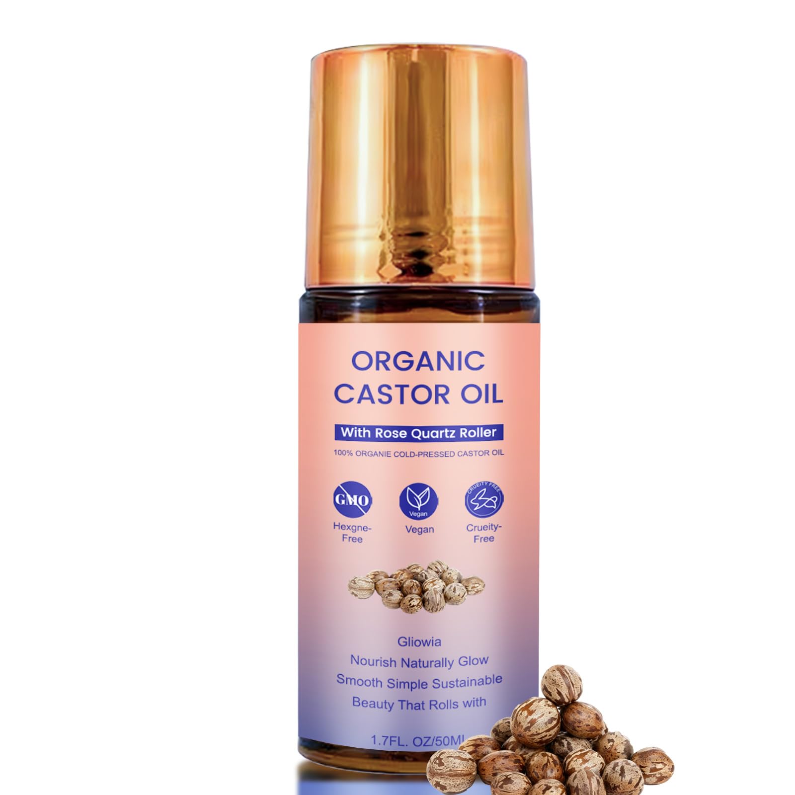 Organic Castor Oil Roller with Rose Quartz | All-Natural Hexane-Free | Cold-Pressed Suitable for Skin Eyebrows and Eyelashes | Sleek Glass Bottle | 50ml (1)