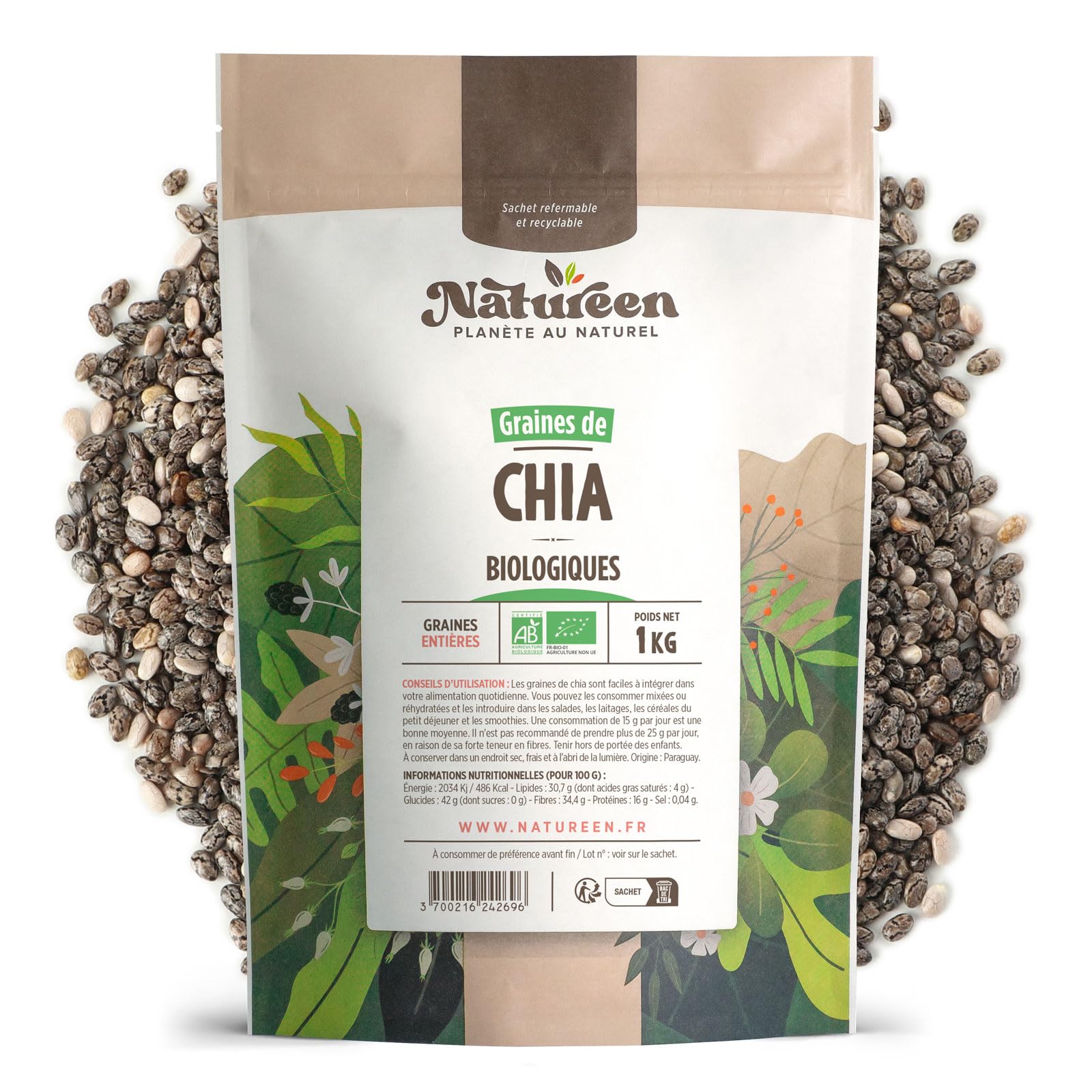 ✓ Take 15 grams. Eat as is, rehydrate, mix with yogurt, compote, pastry, or salad. ✓ Salvia hispanica. ✓ Resealable bag. ?✓ Prendre 15 grammes. Se consomme tel quel, réhydraté, mélangé à un yaourt, compote, pâtisserie, ou salade. ?✓ Salvia hispanica. ?✓ Sachet refermable.