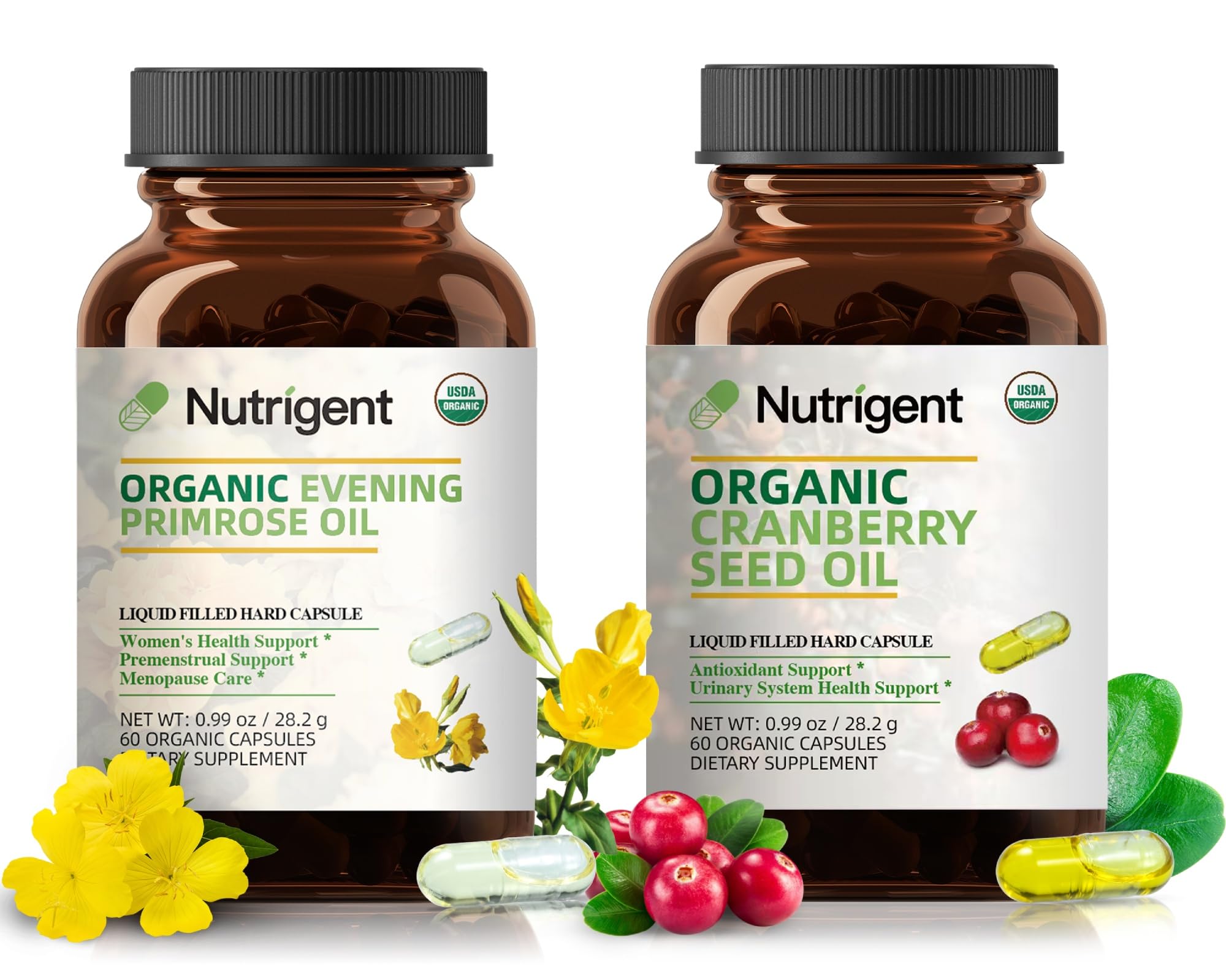Support your body with the power of nature in our Organic Evening Primrose Oil Cranberry Seed Oil Bundle. This women's health supplement combines two premium oils, each 940 mg per serving, in convenient organic liquid capsules designed for maximum absorption and freshness. Evening Primrose Oil capsules are a trusted source of GLA (Gamma-Linolenic Acid), helping support hormonal balance, PMS relief, and menopause comfort, while also nourishing skin for a healthy, radiant glow. Cranberry Seed Oil capsules deliver plant-based Omega 3-6-9, GLA, and oleic acid to promote urinary tract health support, heart wellness, and vibrant skin, making it a clean alternative to fish oil. Both oils are USDA Organic certified and extracted through a gentle cold-pressed method, ensuring essential fatty acids and nutrients remain active and bioavailable. Our quick-release capsules are designed to block oxidation, keeping the oils fresh and effective. This bundle is free from gluten, soy, dairy, preservatives, and artificial additives—making it a pure and natural choice for women seeking hormonal balance, skin health, and urinary wellness. Choose this organic supplement set to experience complete daily support for women's health and vitality.[Clean Gentle Formula] Free from artificial colors, flavors, sweeteners, preservatives, gluten, soy, dairy, and fish. A pure, plant-based supplement bundle designed for women seeking natural hormone balance, urinary health, and skin vitality. [Quick Release High Absorption] Encapsulated in organic hard capsules for faster release and better absorption, this bundle ensures your body gets the maximum benefits of both oils—GLA, Omega fatty acids, and natural antioxidants. [Organic Liquid Capsules for Freshness] Our innovative organic liquid-filled capsules are designed to block oxygen and prevent oil oxidation. This keeps both Evening Primrose Oil and Cranberry Seed Oil fresh, stable, and bioactive, preserving essential fatty acids and nutrients. [Dual Support for Women's Health] Evening Primrose Oil provides natural GLA to help balance hormones, ease PMS menopause discomfort, and support radiant skin. Cranberry Seed Oil promotes urinary tract health and delivers plant-based Omega 3-6-9 for overall wellness. [USDA Organic Certified 100 Pure] Each capsule in this Women's Health Bundle contains USDA Organic certified Evening Primrose Oil and Cranberry Seed Oil. Both are cold-pressed and plant-sourced, ensuring maximum purity, potency, and natural benefits without fillers or synthetic additives.