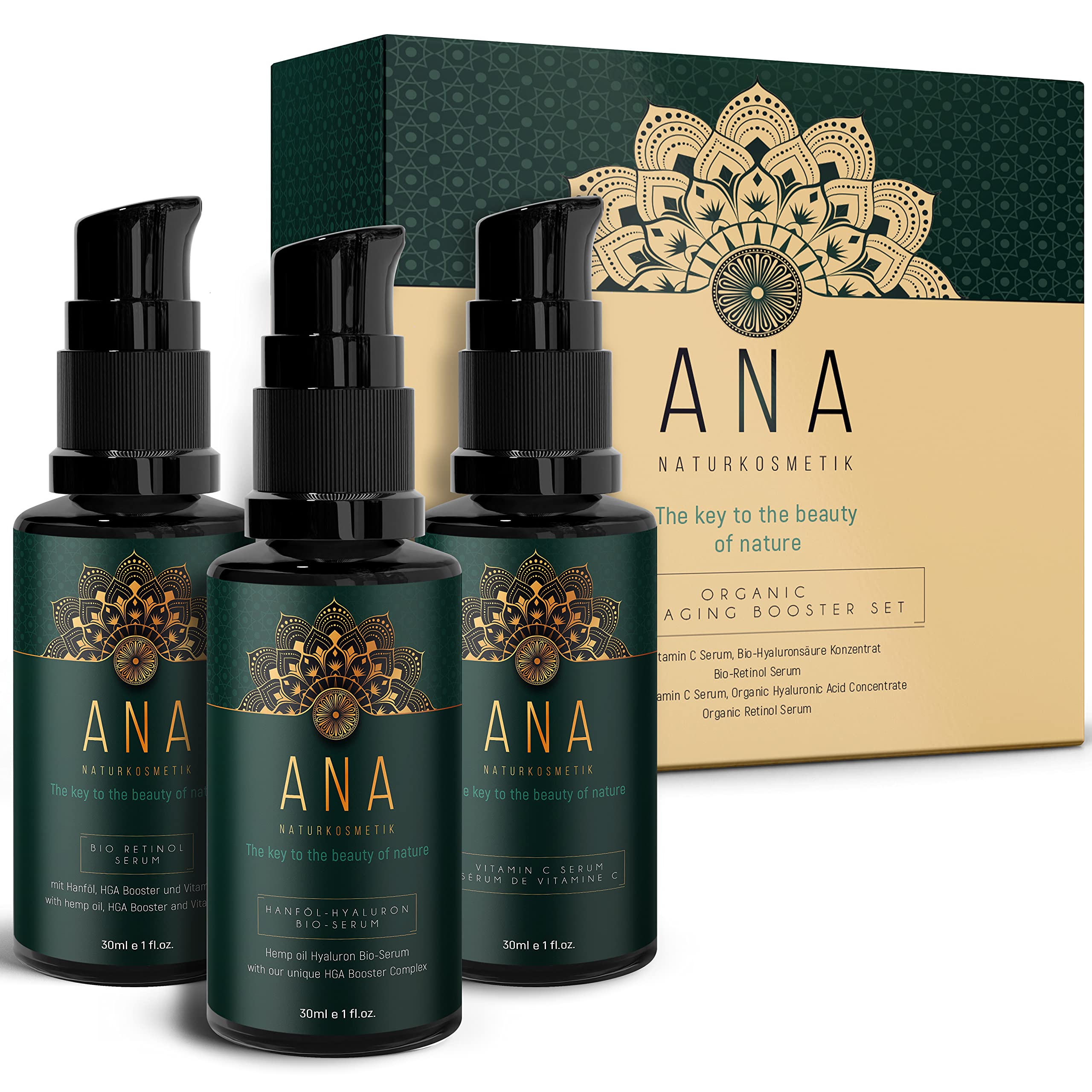 DECIDE NOW TO HAVE BEAUTIFUL RADIANT SKIN - The ANA natural cosmetics team offers you a diverse range of products that are not only effective but also manufactured with respect for the environment. Our quality ingredients are suitable for all skin types, even the most sensitive and dry. Experience them and choose ANA for the love of your skin and the environment. NO ANIMAL TESTING - VEGAN - MADE IN GERMANY - All our products are not tested on animals and are completely vegan. In addition, we do not use controversial additives: NO parabens, NO PEGs. Our hyaluronic serum is made in Germany and dermatologically tested. RADIANT SKIN WITH QUALITY ORGANIC INGREDIENTS - The moisturizing serum, composed of long-chain and short-chain hyaluronic acid, is highly concentrated and acts deeply. High-quality ingredients moisturize the skin and prevent wrinkles. REDUCES AND DIMINISHES SKIN INFECTIONS - ANA Vitamin C Serum is ideal for treating wrinkles, hyperpigmentation, and age-related or environmental spots. The formula we developed with quality content provides immediate hydration. This serum is suitable for all skin types, regardless of tone or color. HIGH-QUALITY ORGANIC INGREDIENTS FOR FACE, NECK, AND DÉCOLLETÉ - Astraxanthin, an effective free radical scavenger, soothing and nourishing allantoin, hydrating and regenerating panthenol, and vitamin E, which replenishes the skin's moisture reserves and boosts natural collagen synthesis, complement each other perfectly with our highly effective hyaluronic acid.DÉCIDE MAINTENANT D'AVOIR UNE BEAUTE PEAU ÉCLATÉE- L'équipe de cosmétiques naturels ANA t'offre une gamme de produits variés qui sont non seulement efficaces mais aussi fabriqués dans le respect de l'environnement. Nos ingrédients de qualité conviennent à tous les types de peau, même les plus sensibles et les plus sèches. Fais-en l'expérience et choisis ANA pour l'amour de ta peau et de l'environnement. SANS ESSAIS SUR LES ANIMAUX - VEGAN - MADE IN GERMANY- Tous nos produits ne sont pas testés sur les animaux et sont entièrement végétaliens. De plus, nous n'utilisons pas d'additifs controversés : SANS parabènes, SANS PEGs. Notre sérum hyaluronique est fabriqué en Allemagne et testé dermatologiquement. UNE PEAU ÉCLATÉE PAR DES INGRÉDIENTS BIO DE QUALITÉ - Le sérum hydratant, composé d'acide hyaluronique à chaîne longue et à chaîne courte, est très concentré et agit en profondeur. Des ingrédients de haute qualité hydratent la peau et préviennent les rides. RÉDUIT ET DIMINUE LES INFECTIONS DE LA PEAU - Le sérum ANA à la vitamine C est idéal pour le traitement des rides, de l'hyperpigmentation et des taches dues à l'âge ou à l'environnement. La formule que nous avons développée avec un contenu de qualité fournit une hydratation immédiate. Ce sérum convient à tous les types de peau, indépendamment du ton ou de la couleur. INGRÉDIENTS BIO DE HAUTE QUALITÉ POUR LE VISAGE, LE COU ET LA DÉCOLLETÉ - L'astraxanthine, un capteur efficace de radicaux libres, l'allantoïne apaisante et nourrissante, le panthénol hydratant et régénérant et la vitamine E, qui reconstitue les réserves d'humidité de la peau et relance la synthèse naturelle du collagène, se complètent parfaitement avec notre acide hyaluronique hautement efficace.