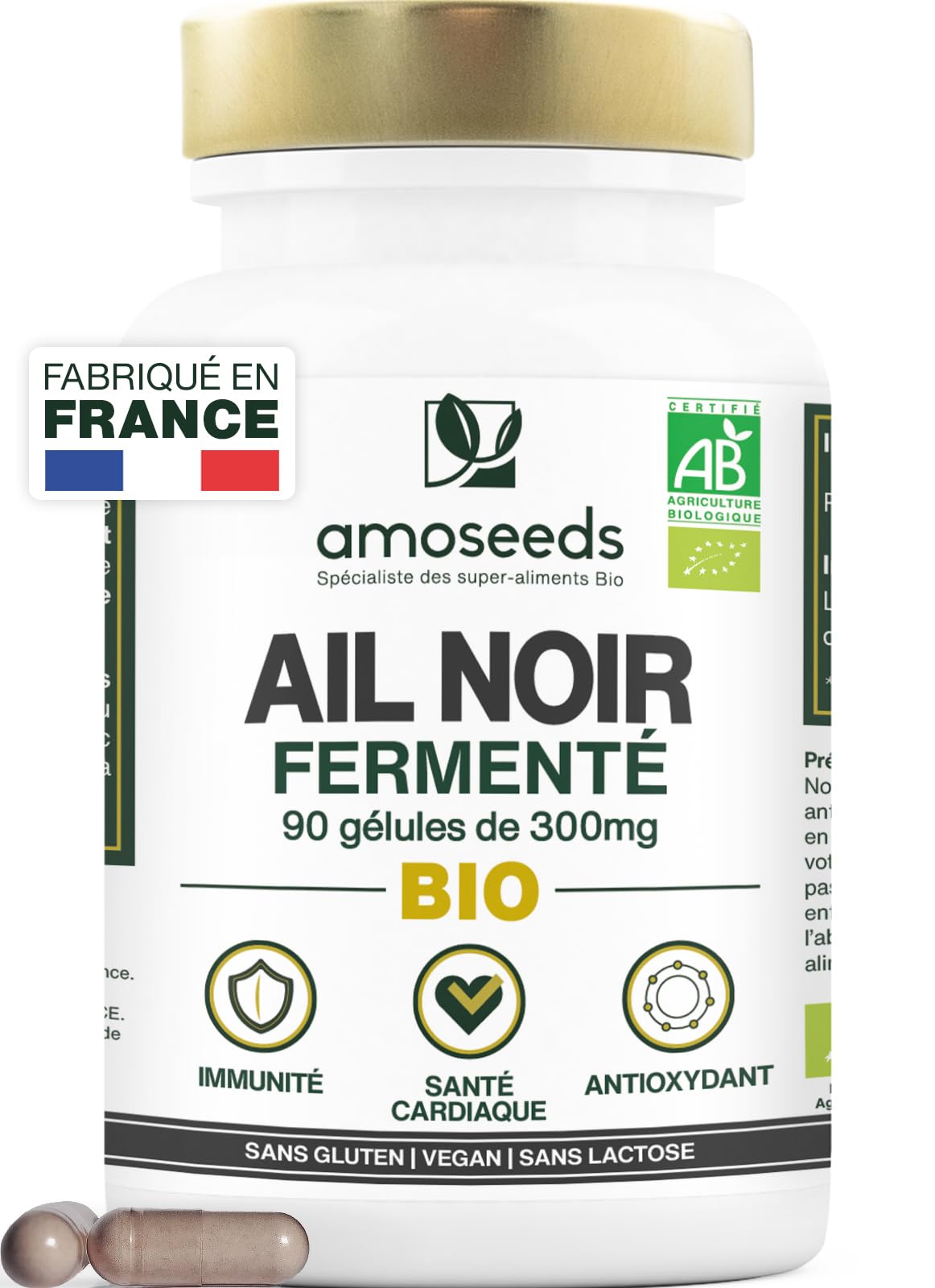 ✓ CERTIFIED ORGANIC: Recyclable resealable box of 90 capsules of 300 mg of amoseeds Premium Organic Black Garlic Powder. 100 vegan product, no preservatives, no GMOs, no pesticides, no artificial colors, no gluten and no lactose. Each batch is tested by third parties to ensure their quality and purity. ✓ ANTIOXIDANT, AGING: A valuable source of antioxidants, Organic Black Garlic will be beneficial for blood circulation, cardiovascular health, immunity, but also to protect the body as a whole. By increg the body's antioxidant capacity, this plant helps slow down premature aging to keep the body in great shape! ✓ IMMUNITY, RESPIRATORY HEALTH: Organic Black Garlic is also known to help strengthen immunity and maintain a healthy respiratory system. Its powerful antioxidant properties will help support the body's natural defenses, but also help soothe irritated throats to contribute to respiratory well-being. This plant will therefore be a real ally in cases of low immunity or during seasonal changes. ✓ BLOOD CIRCULATION: rich in antioxidants and allicin, its active ingredient, Black Garlic contributes to good blood circulation. Indeed, allicin is known to promote blood fluidity, which helps maintain a healthy circulatory system as well as good overall blood circulation. ✓ HEART HEALTH: a natural ally of the heart, Organic Black Garlic contributes to good cardiovascular health. Thanks to its richness in antioxidants, it promotes good cardiac function and helps take care of the heart and blood vessels. It thus acts as a real cardiac protector and will be recommended to people who wish to maintain their cardiovascular health naturally.✓ CERTIFIÉ BIOLOGIQUE : boîte refermable recyclable de 90 gélules de 300 mg de poudre d'Ail Noir Biologique de Qualité Supérieure amoseeds. Produit 100 vegan, sans conservateur, sans OGM, sans pesticides, sans colorant artificiel, sans gluten et sans lactose. Chaque lot est testé par des tiers afin de s'assurer de leur qualité et leur pureté. ✓ ANTIOXYDANT, VIEILLISSEMENT : source précieuse d'antioxydants, l'Ail Noir Bio sera bénéfique pour la circulation sanguine, la santé cardiovasculaire, l'immunité, mais aussi pour protéger le corps dans sa globalité. En augmentant la capacité antioxydante de l'organisme, cette plante aide à ralentir le vieillissement prématuré afin de conserver un corps en pleine forme !. ✓ IMMUNITÉ, SANTÉ RESPIRATOIRE : l'Ail Noir Bio est également réputé pour aider à renforcer l'immunité et à conserver un système respiratoire sain. Ses puissantes vertus antioxydantes vont permettre de soutenir les défenses naturelles de l'organisme, mais aussi aider à apaiser les gorges irritées afin de contribuer au bien-être respiratoire. Cette plante sera donc une réelle alliée en cas de faible immunité ou lors de changements de saison. ✓ CIRCULATION SANGUINE : riche en antioxydants et en allicine, son principe actif, l'Ail Noir participe à la bonne circulation sanguine. En effet, l'allicine est reconnue pour favoriser la fluidité sanguine, ce qui permet de conserver un système circulatoire en bonne santé ainsi qu'une bonne circulation sanguine globale. ✓ SANTÉ DU COEUR : allié naturel du coeur, l'Ail Noir Bio participe à la bonne santé cardiovasculaire. Grâce à sa richesse en antioxydant, il favorise une bonne fonction cardiaque et aide à prendre soin du cœur ainsi que des vaisseaux sanguins. Il agit ainsi comme réel protecteur cardiaque et sera conseillé aux personnes qui souhaitent entretenir leur santé cardiovasculaire naturellement.