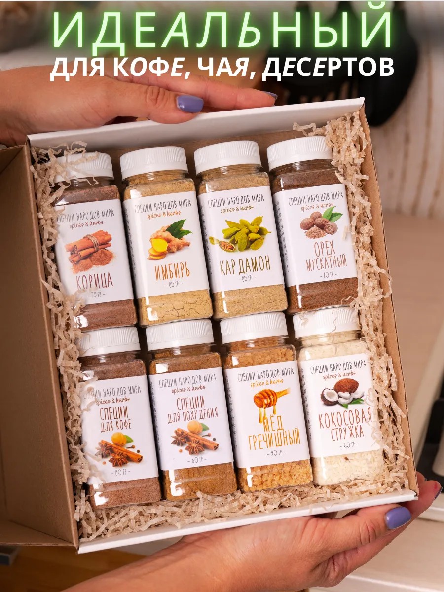 Специи и приправы в наборе - это отличный вкусный презент! Ваши близкие точно оценят входящие в набор молотые десертные пряности. Ароматные добавки для выпечки подойдут также как приправы для кофе с корицей. Вы легко можете использовать их для чая масала, приготовить детокс коктейль для похудения, цикорий. А наши медовые гранулы не оставят равнодушным любителей полезных ПП угощений и блюд. Тост с маслом и гранулированным медом - наш любимый авторский завтрак! Молотая корица, имбирь и кардамон - мастхэв к кофейному ритуалу. А если не хочется смешивать специи самостоятельно, то можно воспользоваться готовой приправой для кофе по-восточному.