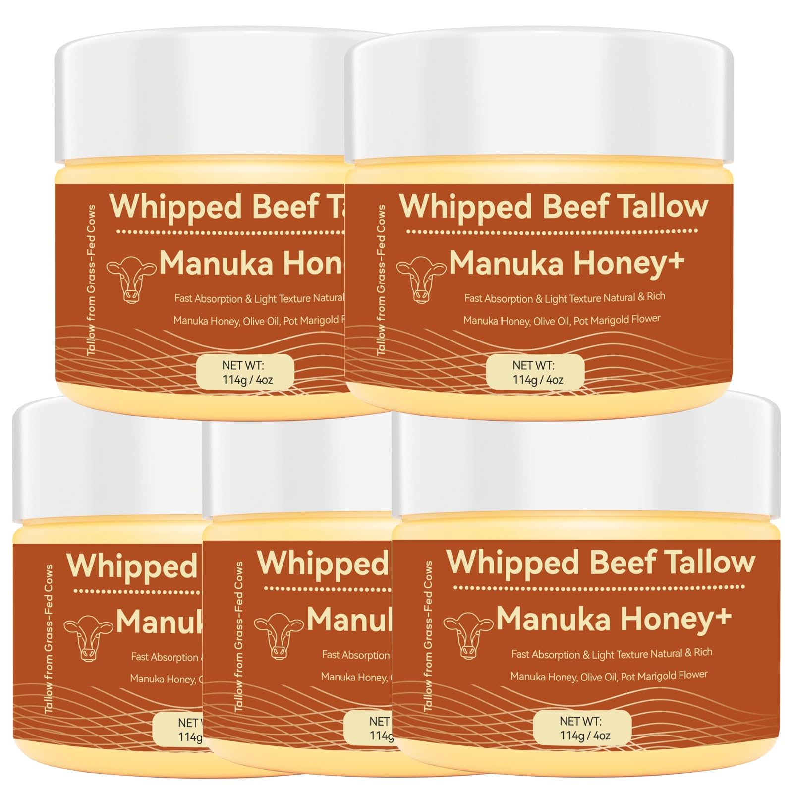 Organic Grass-Fed Beef Tallow Balm (4oz/5pack) - Whipped with Manuka Honey Ultra-Moisturizing for Face & Body Natural Skincare for Dry & Sensitive Skin 4 Fl Oz (Pack of 5)