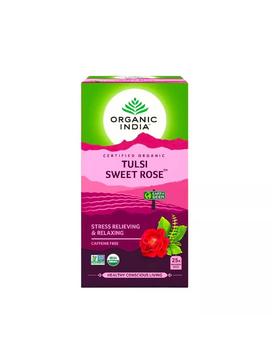 Tulsi Sweet Rose Tea is an Ayurvedic tea that promotes stress relief and relaxation.