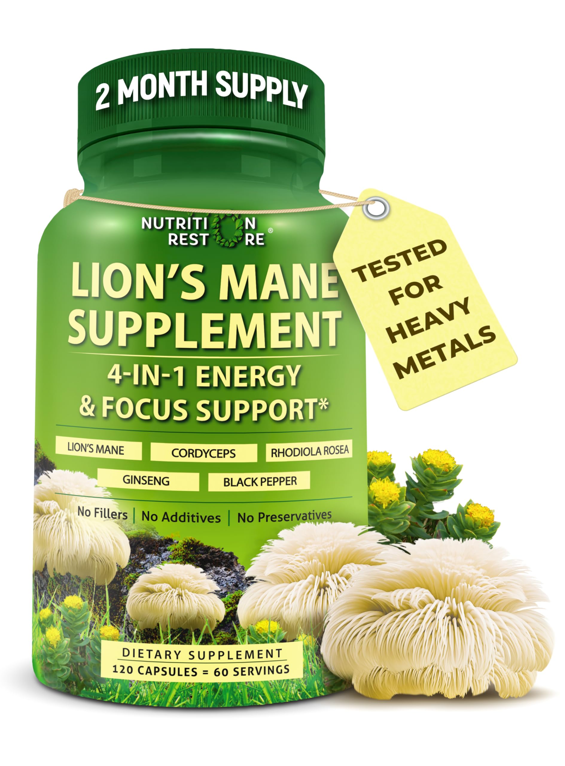3rd-Party Lab Tested: Independently tested for quality, purity, and heavy metals to ensure every batch meets our strict quality standards. Proudly Made in the U.S.: All our supplements are made with high quality, natural, plant-based, gluten-free, non-GMO ingredients. Manufactured with rigorous quality control standards and strict adherence to current Good Manufacturing Practices (cGMP). Enhanced Bioavailability with Mushroom Extracts Organic Black Pepper: 700mg of Lion's Mane 10:1 extract plus 150mg Lion's Mane 20:1 extract, providing the equivalent of 10,000mg of Lion's Mane strength per serving, enhanced with organic black pepper for maximum absorption. Synergetic Cognitive Support Formula: Our lion's mane capsules feature a potent proprietary blend of organic cordyceps, organic rhodiola rosea, and organic ginseng. Together, this 4-in-1 complex supports cognitive function, energy, clarity, and focus. Free from Fillers and Additives: We believe in real ingredients. Our organic lion's mane supplement is made with 100 fruiting bodies, without mycelium, grains, or fillers. It is free from rice flour, magnesium stearate, silicon dioxide and other unnecessary additives. Easy to Swallow: Unlike large pills or messy powders, our organic lion's mane mushroom capsules are easy to swallow and have no distinct scent or flavor. Perfect for convenient daily energy support without digestive discomfort.