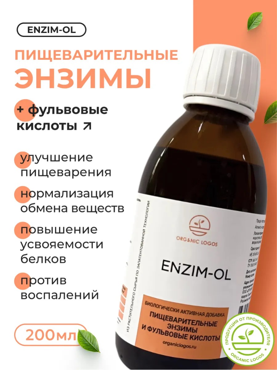 Enzim-OL (Энзим-Ол) от Органик Логос - пищеварительные энзимы с фульвовыми кислотами в удобной жидкой форме объемом 200 мл с мерным колпачком в комплекте.