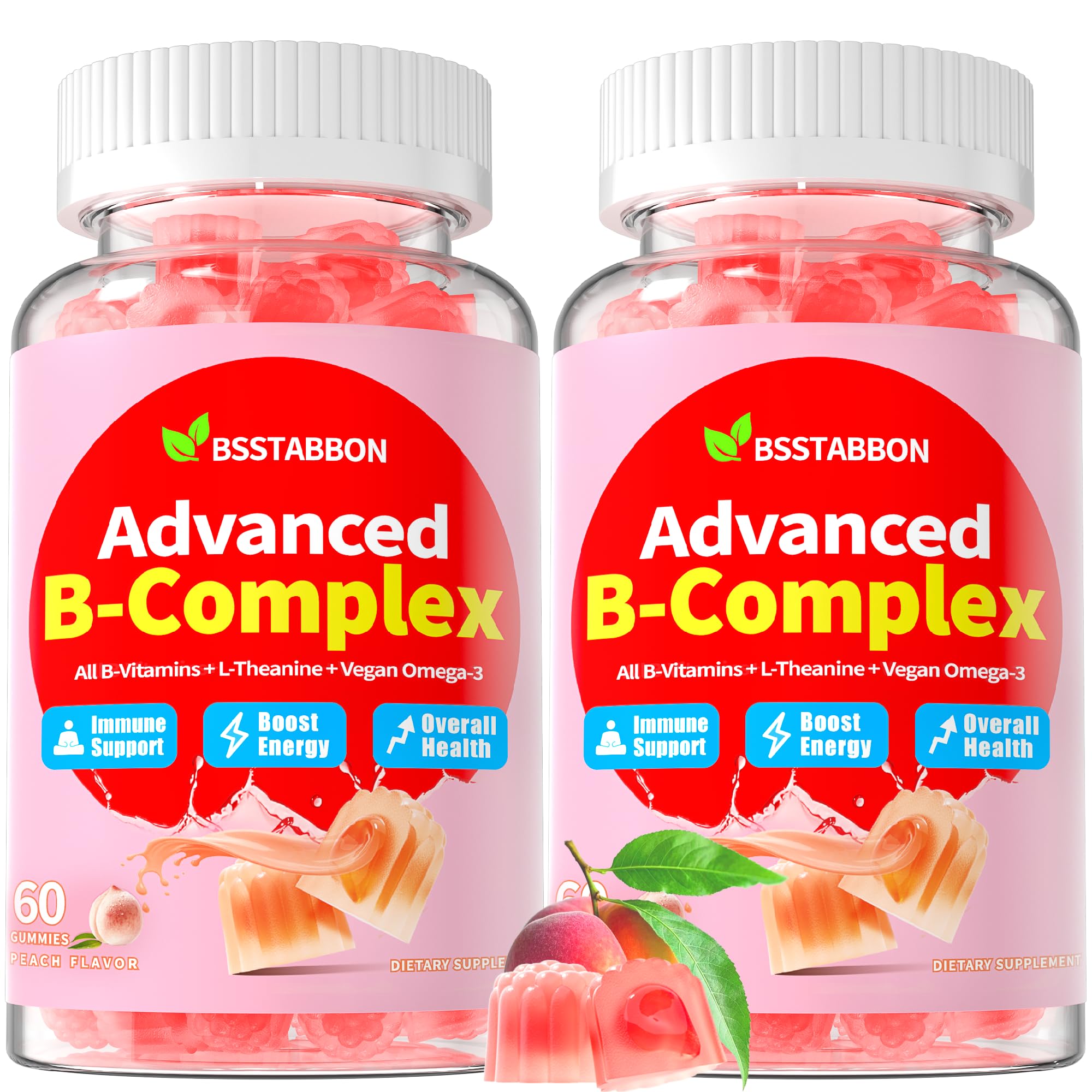 HEALTHY INGREDIENTS TRUSTWORTHY QUALITY: Enjoy a delicious natural peach flavor with our vitamin b gummies. Our sugar-free B supplements provide a tasty, water-free way to support your daily energy—just take two gummies per day. Sweetened with monk fruit extract, they're non-GMO, gelatin-free (made with plant pectin), and free from soy, gluten, artificial colors, and flavors. For any questions, feel free to contact us. ENERGY NERV?S MD IMMUNE: When work and life drain your energy, our B complex gummies deliver a fast-acting vitality boost. Fortified with vitamin C, D3, E, zinc, choline, inositol, TMG, omega-3, and magnesium, this formula provides comprehensive support. Choline and TMG promote methylation, enhancing the bioavailability of B vitamins. Meanwhile, vitamin C aids collagen synthesis, and zinc contributes to immune function.They work together to support daily vitality and well-being. UNIQUE STR?SS-SOOTHING ADAPTOGENIC BLEND: Beyond essential B vitamins, we've infused our formula with str?ss-soothing adaptogenic herbs—including L-Theanine, Ashwagandha, Lemon Balm and Rhodiola Rosea. Our b complex vitamins for women and men are designed to support daily energy and overall wellness. The ingredients work synergistically to promote normal nerv?us system function and help maintain cognitive health as part of a balanced lifestyle. ACTIVE METHYLATED B COMPLEX WITH TMG: Our advanced b complex vitamins formula combines 500mcg methylated B12 and 800mcg 5-MTHF folate—the bioactive forms your body can use immediately—plus 500mg TMG (trimethylglycine) to optimize methylation. With a balanced 1:1:1 ratio of B1:B2:B6, this scientifically designed blend enhances nutrient absorption and energy metab?lism. The sustained-release gummy format delivers steady nutrient support throughout the day,making it both effective and easy to take. FULL-SPECTRUM METHYLATED VITAMIN B COMPLEX GUMMY: BSSTABBON's advanced formula delivers all 8 essential B vitamins in bioactive methylated forms - including methylcobalamin (B12) and 5-MTHF folate - for high absorption and cellular utilization. Enhanced with TMG, omega-3s (EPA DHA), and key nutrients (vitamin D3, zinc, magnesium), this comprehensive blend supports energy, healthy metab?lism, c?gitive function, he?rt health, and overall vitality through scientifically-designed nutrient synergies.