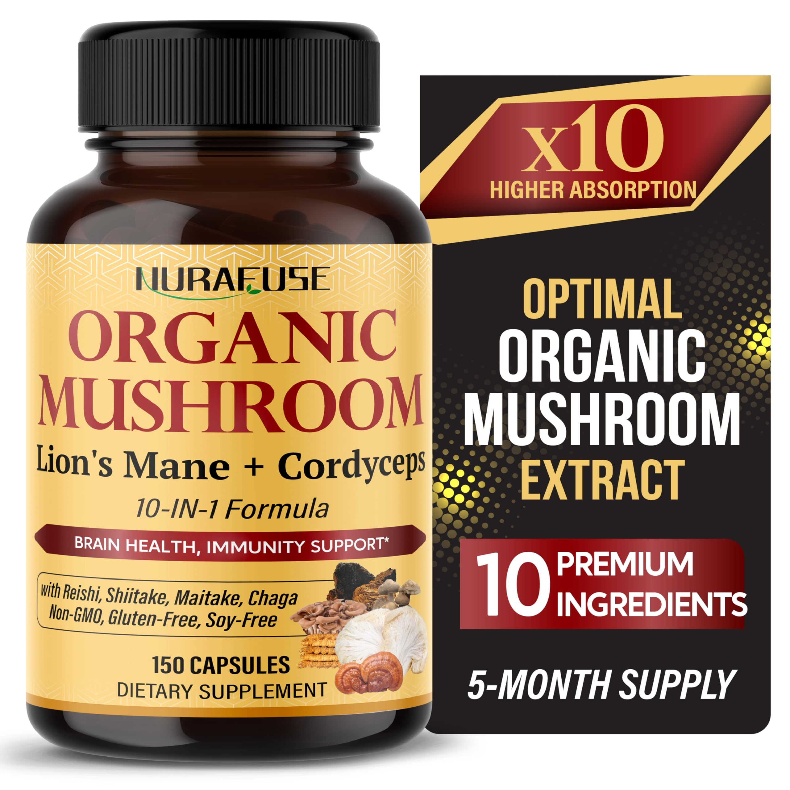 When mornings feel sluggish and staying focused is harder than it used to be it’s more common than you think. That’s where a quality mushroom supplement can make a difference. NuraFuse Organic Mushroom, a powerful mushroom complex with 10 functional mushrooms, including Lion’s Mane, Turkey Tail, Reishi Mushroom, Cordyceps, Chaga and more, support mental clarity and cognitive performance, and keep you feeling focused and productive throughout the day. At the same time, it works to support your body’s natural immune function, helping maintain balance during busy times helping you stay strong and balanced, even when life gets hectic. You may also notice more stable energy, a relaxed, balanced mindset, and a sense of balance throughout your day. Just 1 capsule a day and a 150-day supply, it’s an easy, long-lasting way to feel the difference naturally.Satisfaction Assured: Crafted in GMP certified facilities, Nurafuse premium products prioritize your wellness. Experience results or get a full refund, no questions asked. Trusted & Pure: Nurafuse carefully sources and tests each ingredient at ISO 17025-accredited labs for purity and safety. These ingredients are 100% natural, non-GMO, gluten-free, and chemical-free. 1 Capsule Containing 10 Potent Mushrooms: Lion's Mane, Cordyceps, Reishi, Shiitake, Maitake, Turkey Tail, Chaga, Oyster, Snow, and Agaricus Blazei Mushroom. Optimal Wellness: This supplement is suitable for both men and women, enhances cognitive function, supports the immune system, promotes brain function, and increases focus and clarity. Outstanding 5-Month Mushroom Supply: A single bottle encompasses 150 capsules, providing a convenient 5-month supply that saves you time and effort in promoting your overall well-being.