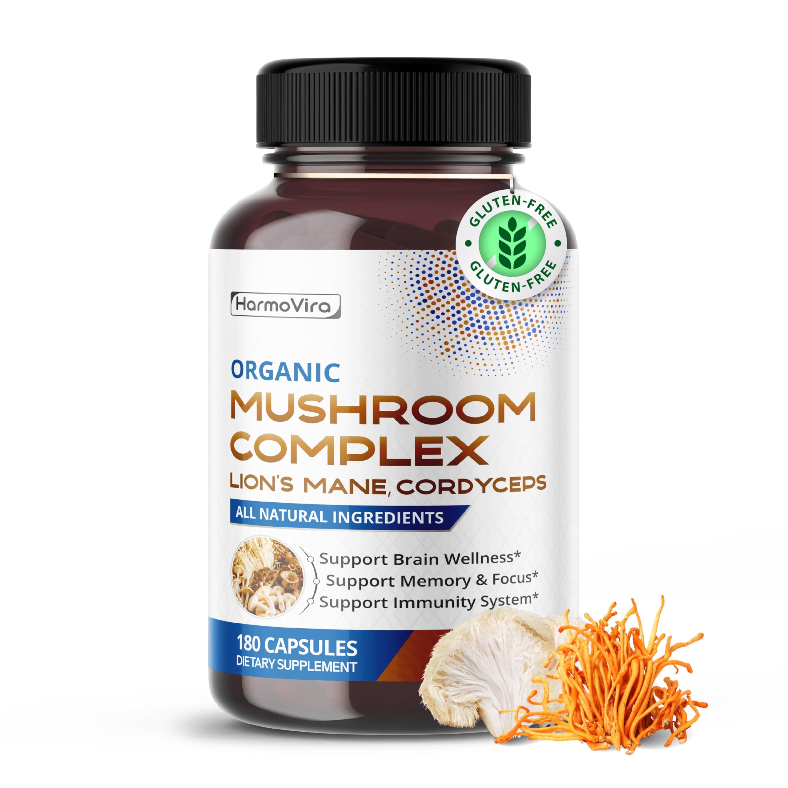 HarmoVira Organic Mushroom Complex with Lion's Mane, Cordyceps Turkey Tail – Brain, Memory Immune Support – 180 Capsules (6-Month Supply)
