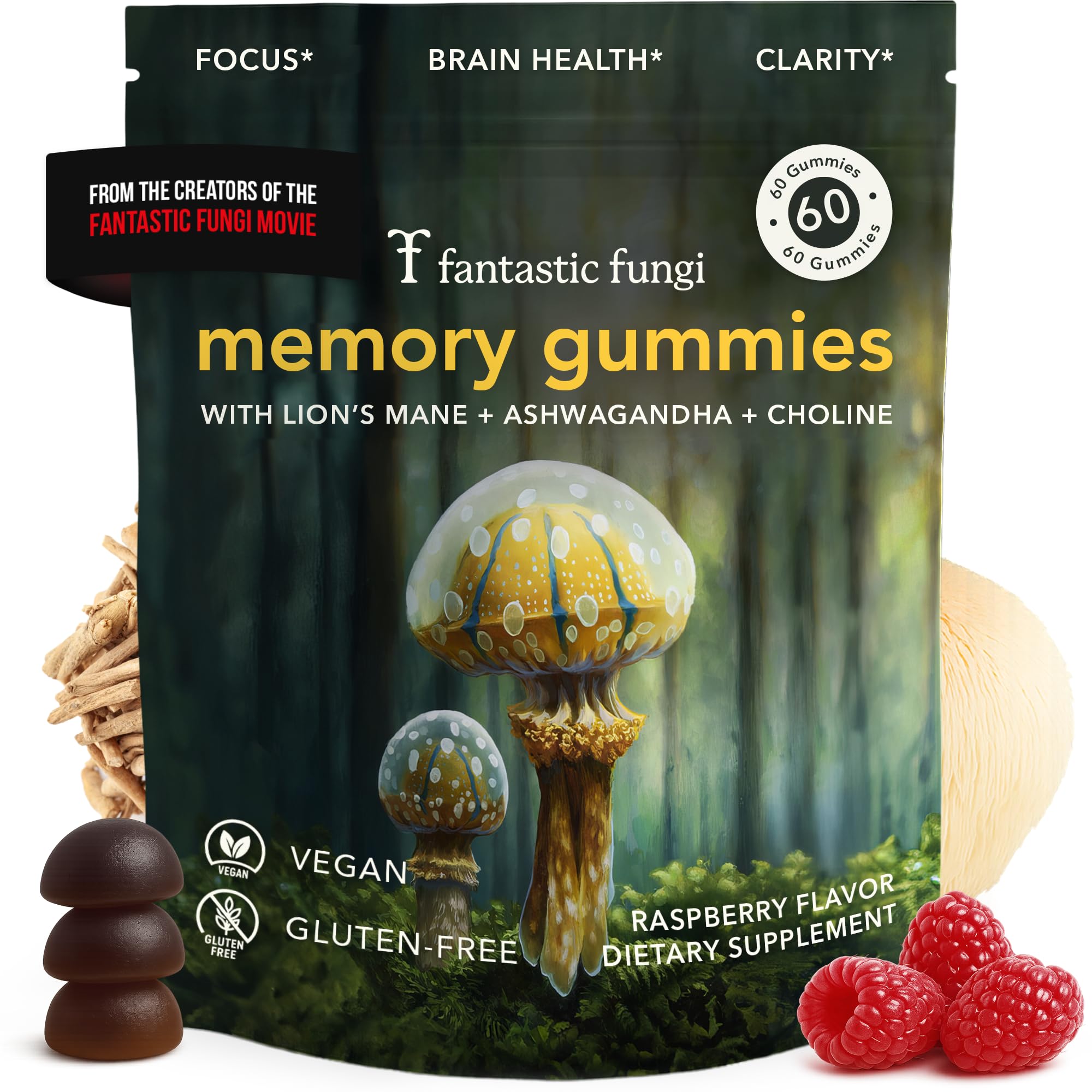 Fantastic Fungi Memory Gummies are a delicious, thoughtful way to support your daily sense of clarity and balance. Powered by nature's most respected botanicals—Lion's Mane, KSM-66 Ashwagandha, and Choline—each brain focus gummies delivers a blend that fits effortlessly into your wellness routine. Lion's Mane mushroom gummies has long been revered for its functional properties. Whether you're tackling a creative project, managing a full schedule, or simply trying to stay present, this time-tested ingredient is a natural companion for daily focus. Paired with KSM-66 Ashwagandha, a clinically studied adaptogen known to support everyday resilience, these gummies offer support that goes beyond the mind. Choline rounds out the blend, helping to nourish your daily mental energy. It's a balanced trio—backed by science, rooted in tradition, and crafted with care. What truly sets these brain gummies apart? The flavor. With a tangy raspberry profile and just 2g of sugar per serving, they're an enjoyable ritual. No stevia, no artificial aftertaste—just a clean, smooth bite you'll look forward to. Fantastic Fungi Memory Gummies are vegan, gluten-free, and third-party tested for quality and consistency. With 60 gummies per bag and flexible serving options, it's a convenient, reliable way to feel more present in your day—every day.CLEAN FORMULA - Our memory supplement for brain are vegan, gluten-free, and made without dairy, soy, or gelatin. Every batch is third-party tested to meet high standards for quality and consistency. REFRESHING RASPBERRY TASTE - With higher absorption than capsule products, our mushroom supplement is easy to chew, easy on the stomach, and features a juicy raspberry taste with a subtle sour berry twist. SUPPORTS BODY BALANCE FLOW - Sourced with care and backed by research, Ashwagandha is a modern adaptogen with ancient roots. It's included here to support a sense of balance in body and mind—helping you move through your day with calm confidence, even when life feels fast. UNLOCK YOUR COGNITIVE POTENTIAL - Long revered in wellness traditions, Lions Mane is a functional mushroom chosen for its unique properties that support everyday mental clarity and focus. whether you're working, creating, or just trying to stay present. NATURALLY SUPPORTS MEMORY RETENTION - Whether you're juggling tasks or trying to stay sharp in conversation, our memory gummies help support everyday memory and recall so you can feel more clear and connected. BOOST YOUR BRAINPOWER - Harness the wisdom of nature with a daily ritual designed to help you stay grounded, focused, and present. Featuring a purposeful blend of Lion's Mane, Ashwagandha, and Choline, our memory focus supplement are your plant-powered companion for navigating the day with intention.