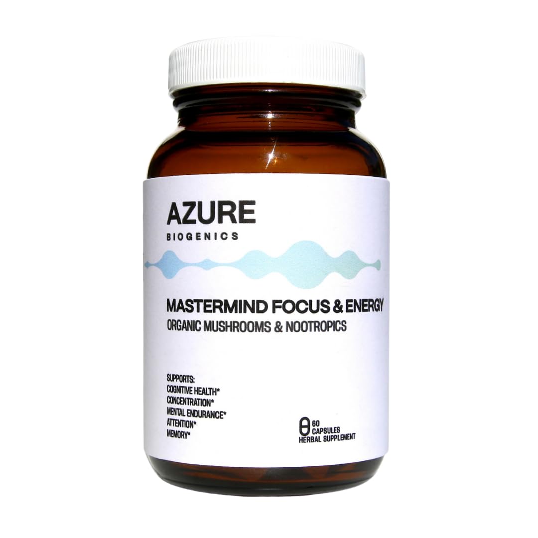 Azure Biogenics - Unmatched Purity - Produced with trust in a GMP and NSF certified facility and third-party tested to ensure safety, purity, and potency. Recharge your health with real results from real ingredients. Clean Natural Ingredients – Crafted with care, scientifically designed by experts to give you real results. Organic, Vegan, Non-GMO, Gluten-free, Soy-free, Kosher certified and free from artificial additives, colors, or preservatives. Plant-Based Vitality – Ginkgo and Rhodiola are included to help promote stamina, endurance, and overall vitality during daily activities. . Premium Mushroom Blend – Includes Lion's Mane, Cordyceps, and other functional botanicals traditionally used to support brain health, memory, and natural energy . Supports Concentration Focus – A carefully balanced blend of mushrooms, herbs, and roots designed to help maintain alertness, clarity, and cognitive performance.