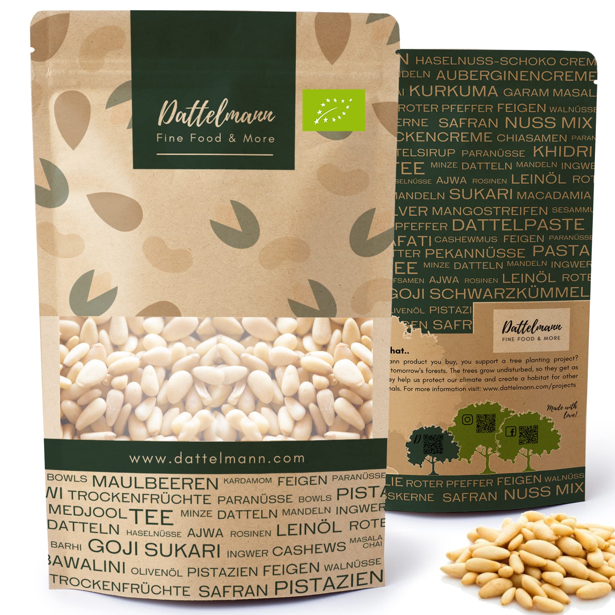 Use: The pine is very suitable for the production of pesto or for cooking.Dattelmann tip: Roast the pine nuts out of the pine nuts because it unfolds their aroma.But since the pine nuts burn slightly, you should be careful when roasting the pine nuts.100 organic: Our are 100 controlled organic cultivation.Heated power: pine nuts have many important and healthy nutrients such as vitamin A or the trace element selenium.Flavor: Our organic pine nuts convince with their fine-buttrous, aromatic taste.MARUCTION: Pine nuts are obtained from the pine.The seeds can be found in the pine trees converted and can only be obtained using an elaborate process.What does not make the whole thing easier is that the trees become up to 3o meters high and the cones only start to wear the pine nuts after about twenty years.It then takes about three years for the kernels to be matured.