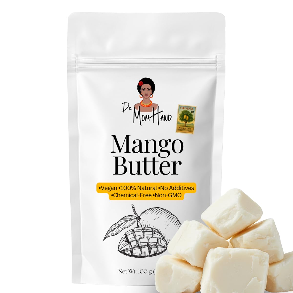 Dr. Mom Hand Mango Butter is 100 pure, organic, unrefined, and additive-free.