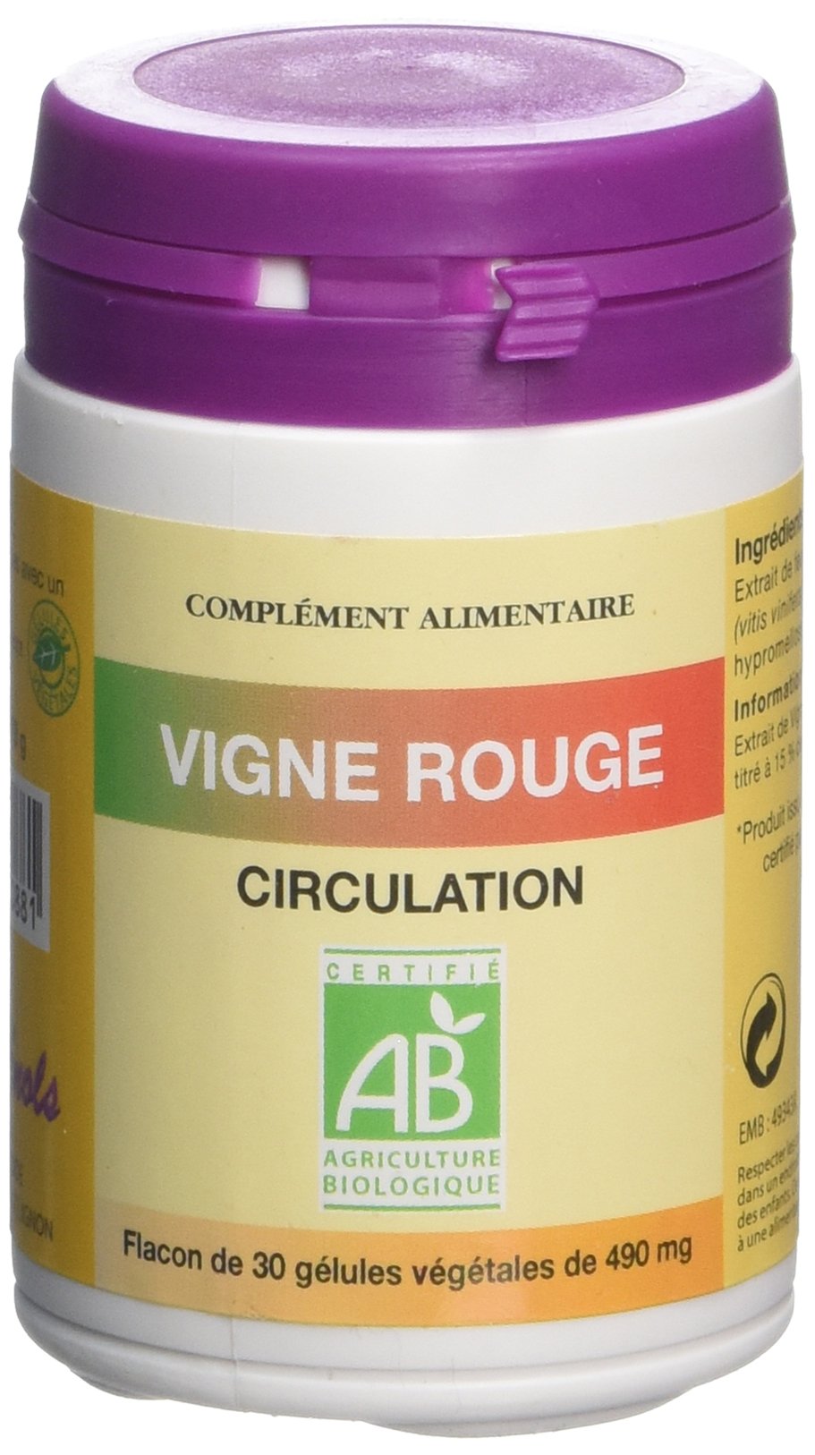 Targeted properties for better blood circulation Red vine is known for toning venous circulation and soothing the feeling of heavy legs. Titrated with 15 polyphenols, active substances of the plant, the red vine of Vinophenols guarantees a product of great effectiveness. It is these famous polyphenols which improve venous circulation. Among them, OPCs (Pro-Cyanidolic Oligomers) are the best known as veinotonics. Anthocyanins preserve the elasticity of the skin. A true cocktail of virtues, Vigne Rouge Bio will quickly become your comfort ally, improving both the well-being and beauty of your legs! INGREDIENTS For 1 capsule: extract of red vine leaves (Vitis vinifera) 400 mg titrated with 15 polyphenols 60 mg, vegetable capsule (hypromellose). Product from organic farming certified by FR–BIO–01 DIRECTIONS FOR USE 1 capsule at lunchtime before a meal. SAFETY WARNING Reserved for adults. Not recommended for pregnant or breastfeeding women and people suffering from blood clotting disorders. It is not recommended to exceed the recommended daily dose. Food supplements should not be used as a substitute for a varied diet. This product should be kept out of the reach of young children. Product from FR-Bio-01 organic farming. Made in France. For better blood circulation. Polyphenols improve venous circulation. Contains 15 polyphenols. Propriétés ciblées pour une meilleure circulation sanguine La vigne rouge est réputée pour toni fier la circulation veineuse et apaiser la sensation de jambes lourdes. Titrée à 15 de polyphénols, substances actives de la plante, la vigne rouge de Vinophénols garantit un produit d'une grande efficacité. Ce sont ces fameux polyphénols qui améliorent la circulation veineuse. Parmi eux, les OPC (Oligomères Pro Cyanidoliques) sont les plus connus comme veinotoniques. Les anthocyanes préservent l'élasticité de la peau. Véritable cocktail de vertus, Vigne Rouge Bio deviendra rapidement l'allié de votre confort, en améliorant à la fois le bien-être et la beauté de vos jambes ! INGRÉDIENTS Pour 1 gélule : extait de feuilles de vigne rouge (Vitis vinifera) 400 mg titré à 15 de polyphénols 60 mg, gélule végétale (hypromellose). Produit issu de l'agriculture biologique certifié par FR–BIO–01 MODE D'EMPLOI 1 gélule le midi avant le repas. AVERTISSEMENT DE SÛRETÉ Réservé aux adultes. Déconseillé aux femmes enceintes ou allaitantes et aux personnes souffrant de troubles de coagulation sanguine. Il est déconseillé de dépasser la dose journalière recommandée. Les compléments alimentaires ne doivent pas être utilisés comme substitut d'un régime alimentaire varié. Ce produit doit être tenu hors de la portée des jeunes enfants. Produit issu de l'Agriculture biologique FR-Bio-01. Fabriqué en France. Pour une meilleure circulation sanguine. Les polyphénols améliorent la circulation veineuse. Titré à 15 de polyphénols.