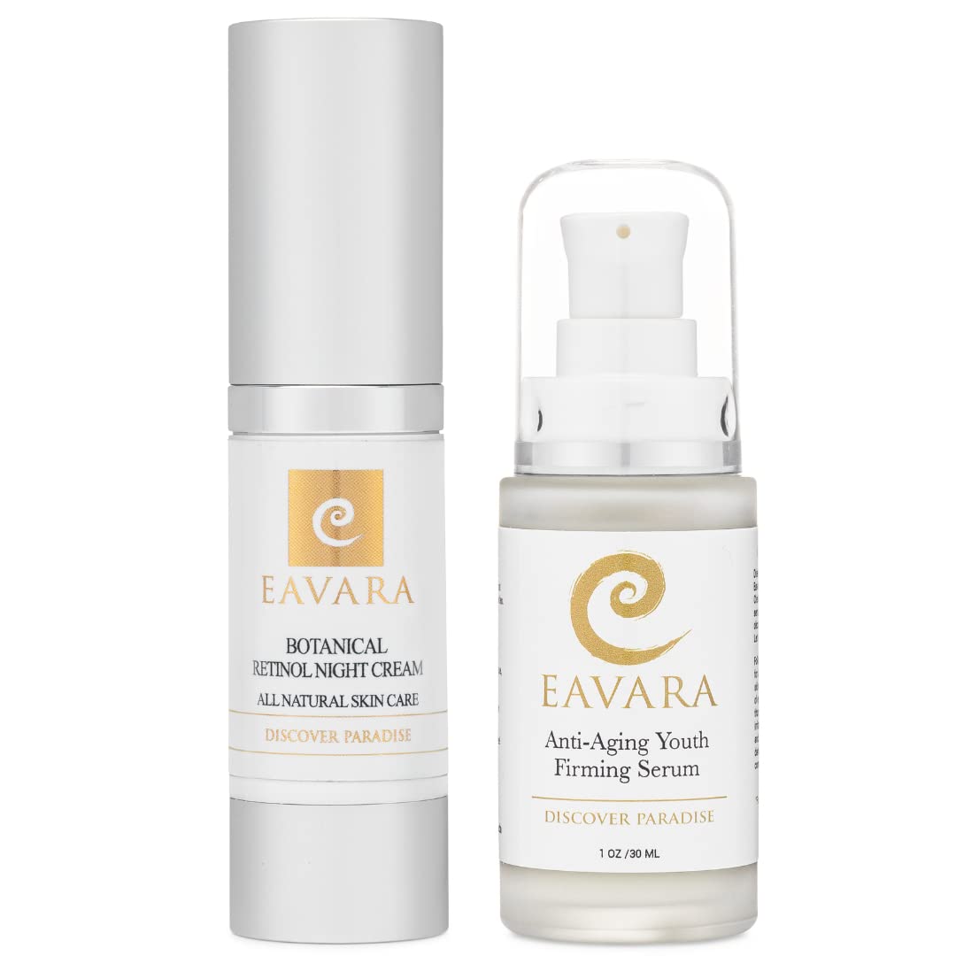AWARD-WINNING SKINCARE: Recognized as Best Anti-Aging Skin Care by the American Choice Awards, Eavara delivers quality and effective skincare solutions you can trust. NATURAL AND CRUELTY-FREE: Our products are free from parabens, sulfates, synthetic fragrances, and other harsh chemicals. We are committed to cruelty-free development and manufacturing practices. AWARD-WINNING SERUM: Our patented organic formula helps reduce the appearance of fine lines, wrinkles, and other signs of aging while lifting and hydrating your skin. NATURAL INGREDIENT BLEND: Our night cream features Retinol GS50 and Hyaluronic Acid, combined with Organic Jojoba, Coconut, and Hemp Seed Oils, Shea Butter, Honey, and Aloe Vera to help reduce the visible signs of aging and enhance your skin's natural beauty. HELP REDUCE THE SIGNS OF AGING: Minimize the appearance of lines, wrinkles, and age spots while supporting your skin's elasticity and firmness with our carefully selected combination of ingredients that promote collagen and elastin production.