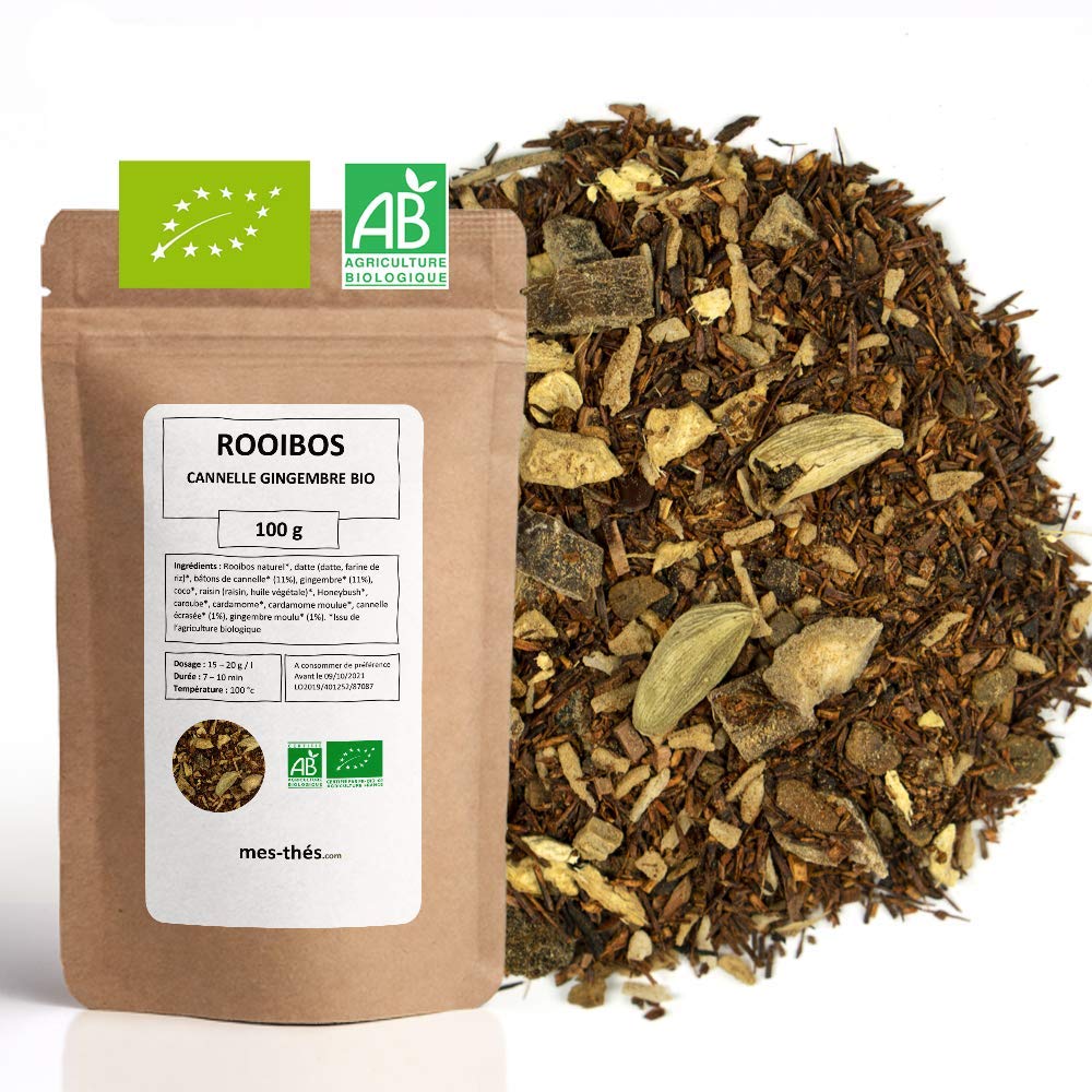 ORGANIC ROOIBOS: Cinnamon Ginger - Rooibos in Bulk Ingredients : Natural rooibos , date (date, rice flour) , cinnamon sticks (11 ), ginger (11 ), coconut , grape (grape, vegetable oil) , Honeybush , carob , cardamom , ground cardamom , crushed cinnamon (1 ), ground ginger (1 ). From organic farming Preparation : Dosage: 15g - 20g L Infusion time: 7 - 10 Min Infusion temperature: 100 C Certification: Organic: Product from organic farming FR-BIO-01 Certification according to the European Organic Agriculture Regulation. Agriculture EU Non-EU agriculture Packaging: 100 grams 40 Cups Zip closure (better conservation) All Teas, Infusions and Rooibos from around the world and beyond. With exquisite flavors that travel around the world, each cup is a perfect taste experience. This is what Mes-thés.com has symbolized for years. Our experienced and creative teams travel the world to select only the best teas, fruits and ingredients for our customers. They are then mixed and processed according to our testers' recipes. Our unique compositions are produced by hand in small batches of fresh products. It is this quality standard that guarantees the success of our brand. The inestimable result of this artisanal work concocted by enthusiasts: more than 600 teas, infusions and rooibos appearing in our catalog. Our catalog invites you to discover numerous creations in terms of appearance and flavor. We create the most beautiful recipes based on nature's treasures. Our goal is to offer you the best quality for the best tasting. INGREDIENTS Natural rooibos , date (date, rice flour) , cinnamon sticks (11 ), ginger (11 ), coconut , grape (grape, vegetable oil) , Honeybush , carob , cardamom , ground cardamom , crushed cinnamon (1 ), ground ginger (1 ). From organic farming DIRECTIONS FOR USE Dosage: 15g - 20g L Infusion time: 7 - 10 Min Infusion temperature: 100 C SAFETY WARNING Contains ginger and cinnamon. May cause allergic reactions. Do not give to children. ? 100 SATISFIED OR YOUR MONEY BACK: Mes-Thés is a French brand. In order to always satisfy you, we work with the same line of conduct: To introduce you to exceptional products. Products grown and harvested with respect for nature and the people who work in their production. All our products are selected with ? and packaged in France. Listening to your expectations and desires. Do not hesitate to contact us for any questions. Enjoy your tasting. ? CERTIFIED ORGANIC AGRICULTURE: Our producers do not use chemical fertilizers or pesticides. Our team explores the most remote growing areas on earth. You will find only the best plants in our assortments. We are constantly looking for superior quality and absolute taste. Our control and certification body is Ecocert. SACHET: 100 grams 40 Cups Zip closure (better preservation). INGREDIENTS: Natural Rooibos , date (date, rice flour) , cinnamon sticks (11 ), ginger (11 ), coconut , raisin (raisin, vegetable oil) , Honeybush , carob , cardamom , ground cardamom , crushed cinnamon (1 ), ground ginger (1 ). From organic farming. ORGANIC ROOIBOS: Cinnamon Ginger - Loose Rooibos. ROOIBOS BIO : Cannelle Gingembre - Rooibos en Vrac Ingrédients : Rooibos naturel , datte (datte, farine de riz) , bâtons de cannelle (11 ), gingembre (11 ), coco , raisin (raisin, huile végétale) , Honeybush , caroube , cardamome , cardamome moulue , cannelle écrasée (1 ), gingembre moulu (1 ). Issu de l'agriculture biologique Préparation : Dosage : 15g - 20g L Temps d'infusion : 7 - 10 Min Températue d'infusion : 100 C Certification : Bio : Produit issu de l'agriculture biologique FR-BIO-01 Certification selon le Règlement européen de l'agriculture biologique. Agriculture UE Agriculture non-UE Conditionnement : 100 grammes 40 Tasses Fermeture avec Zip (meilleur conservation) Tous les Thés, Infusions et Rooibos du monde et d'ailleurs. Grâce á des saveurs exquises, qui font le tour du monde, chaque tasse est une expérience gustative parfaite. C'est ce que Mes-thés.com symbolise depuis des années. Nos équipes expérimentées et créatives voyagent dans le monde entier afin de sélectionner uniquement les meilleurs thés, fruits et ingrédients pour nos clients. Ils sont ensuite mélangés et traités selon les recettes de nos testeurs. Nos compositions uniques sont produites à la main en petit lots de produits frais. C'est ce standard de qualité qui garantie le succès de notre marque. Le résultat inestimable de ce travail artisanal concocté par des passionnés : c'est plus de 600 thés,infusions et rooibos figurant dans notre catalogue. Notre catalogue vous invite à découvrir de nombreuses créations en matière d'aspect et de saveur. Nous créons les plus belles recettes à base des trésors de la nature. Notre objectif est de vous proposer la meilleure qualité pour la meilleure dégustation. INGRÉDIENTS Rooibos naturel , datte (datte, farine de riz) , bâtons de cannelle (11 ), gingembre (11 ), coco , raisin (raisin, huile végétale) , Honeybush , caroube , cardamome , cardamome moulue , cannelle écrasée (1 ), gingembre moulu (1 ). Issu de l'agriculture biologique MODE D'EMPLOI Dosage : 15g - 20g L Temps d'infusion : 7 - 10 Min Températue d'infusion : 100 C AVERTISSEMENT DE SÛRETÉ Contient du gingembre et de la cannelle. Peut causer des réactions allergiques. Ne pas donner aux enfants. ? 100 SATISFAIT OU REMBOURSÉ : Mes-Thés est une marque Française. Afin de toujours vous satisfaire nous travaillons avec la même ligne de conduite: Vous faire découvrir des produits exceptionnels. Des produits cultivés et récoltés dans le respect de la nature et des hommes qui travaillent à leur production. Tous nos produits sont sélectionnés avec ? et conditionnés en France. Être à l'écoute de vos attentes et envies. N'hésitez pas à nous contacter pour toutes vos questions Bonne dégustation. ? CERTIFIÉ AGRICULTURE BIOLOGIQUE : Nos producteurs n'utilisent pas d'engrais chimiques ni de pesticides. Notre équ