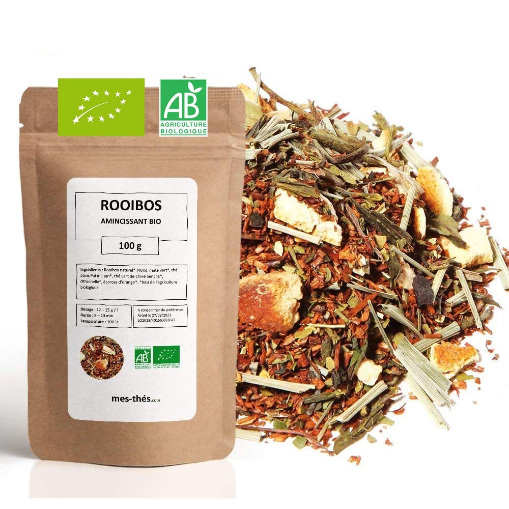 ORGANIC ROOIBOS: Slimming - Bulk Rooibos Ingredients : Natural rooibos (46 ), green mate , Pai mu tan white tea , Sencha Chinese green tea , lemongrass , orange peel . From organic farming Preparation : Dosage: 15g - 20g L Infusion time: 7 - 10 Min Infusion temperature: 100 C Certification: Organic: Product from organic farming FR-BIO-01 Certification according to the European Organic Agriculture Regulation. Agriculture EU Non-EU agriculture Packaging: 100 grams 40 Cups Zip closure (better conservation) All Teas, Infusions and Rooibos from around the world and beyond. With exquisite flavors that travel around the world, each cup is a perfect taste experience. This is what Mes-thés.com has symbolized for years. Our experienced and creative teams travel the world to select only the best teas, fruits and ingredients for our customers. They are then mixed and processed according to our testers' recipes. Our unique compositions are produced by hand in small batches of fresh products. It is this quality standard that guarantees the success of our brand. The inestimable result of this artisanal work concocted by enthusiasts: more than 600 teas, infusions and rooibos appearing in our catalog. Our catalog invites you to discover numerous creations in terms of appearance and flavor. We create the most beautiful recipes based on nature's treasures. Every day, we handcraft the largest range of organic teas in the world. Our goal is to offer you the best quality for the best tasting. INGREDIENTS Natural rooibos (46 ), green mate , Pai mu tan white tea , Sencha Chinese green tea , lemongrass , orange peel . From organic farming DIRECTIONS FOR USE Dosage: 15g - 20g L Infusion time: 7 - 10 Min Infusion temperature: 100 C ? 100 SATISFIED OR YOUR MONEY BACK: Mes-Thés is a French brand. In order to always satisfy you, we work with the same line of conduct: To introduce you to exceptional products. Products grown and harvested with respect for nature and the people who work in their production. All our products are selected with ? and packaged in France. Listening to your expectations and desires. Do not hesitate to contact us for any questions. Enjoy your tasting. ? CERTIFIED ORGANIC AGRICULTURE: Our producers do not use chemical fertilizers or pesticides. Our team explores the most remote growing areas on earth. You will find only the best plants in our assortments. We are constantly looking for superior quality and absolute taste. Our control and certification body is Ecocert. SACHET: 100 grams 40 Cups Zip closure (better preservation). INGREDIENTS: Natural Rooibos (46 ), green mate , Pai mu tan white tea , Sencha Chinese green tea , lemongrass , orange peel . From organic farming. ORGANIC ROOIBOS: Slimming - Loose Rooibos. ROOIBOS BIO : Amincissant - Rooibos en Vrac Ingrédients : Rooibos naturel (46 ), maté vert , thé blanc Pai mu tan , thé vert de chine Sencha , citronnelle , écorces d'orange . Issu de l'agriculture biologique Préparation : Dosage : 15g - 20g L Temps d'infusion : 7 - 10 Min Températue d'infusion : 100 C Certification : Bio : Produit issu de l'agriculture biologique FR-BIO-01 Certification selon le Règlement européen de l'agriculture biologique. Agriculture UE Agriculture non-UE Conditionnement : 100 grammes 40 Tasses Fermeture avec Zip (meilleur conservation) Tous les Thés, Infusions et Rooibos du monde et d'ailleurs. Grâce á des saveurs exquises, qui font le tour du monde, chaque tasse est une expérience gustative parfaite. C'est ce que Mes-thés.com symbolise depuis des années. Nos équipes expérimentées et créatives voyagent dans le monde entier afin de sélectionner uniquement les meilleurs thés, fruits et ingrédients pour nos clients. Ils sont ensuite mélangés et traités selon les recettes de nos testeurs. Nos compositions uniques sont produites à la main en petit lots de produits frais. C'est ce standard de qualité qui garantie le succès de notre marque. Le résultat inestimable de ce travail artisanal concocté par des passionnés : c'est plus de 600 thés,infusions et rooibos figurant dans notre catalogue. Notre catalogue vous invite à découvrir de nombreuses créations en matière d'aspect et de saveur. Nous créons les plus belles recettes à base des trésors de la nature. Chaque jour, nous produisons artisanalement la plus grande gamme de thés bio au monde. Notre objectif est de vous proposer la meilleure qualité pour la meilleure dégustation. INGRÉDIENTS Rooibos naturel (46 ), maté vert , thé blanc Pai mu tan , thé vert de chine Sencha , citronnelle , écorces d'orange . Issu de l'agriculture biologique MODE D'EMPLOI Dosage : 15g - 20g L Temps d'infusion : 7 - 10 Min Températue d'infusion : 100 C ? 100 SATISFAIT OU REMBOURSÉ : Mes-Thés est une marque Française. Afin de toujours vous satisfaire nous travaillons avec la même ligne de conduite: Vous faire découvrir des produits exceptionnels. Des produits cultivés et récoltés dans le respect de la nature et des hommes qui travaillent à leur production. Tous nos produits sont sélectionnés avec ? et conditionnés en France. Être à l'écoute de vos attentes et envies. N'hésitez pas à nous contacter pour toutes vos questions Bonne dégustation. ? CERTIFIÉ AGRICULTURE BIOLOGIQUE : Nos producteurs n'utilisent pas d'engrais chimiques ni de pesticides. Notre équipe explore les zones de culture les plus reculées de la terre. Vous trouverez uniquement les meilleurs plantes dans nos assortiments. Nous sommes en permanence à la recherche de la qualité supérieure et du goût absolu. Notre organisme de contrôle et de certification est Ecocert. SACHET : 100 grammes 40 Tasses Fermeture avec Zip (meilleur conservation). INGRÉDIENTS : Rooibos naturel (46 ), maté vert , thé blanc Pai mu tan , thé vert de chine Sencha , citronnelle , écorces d'orange . Issu de l'agriculture biologique. ROOIBOS BIO : Amincissant - Rooibos en Vrac.