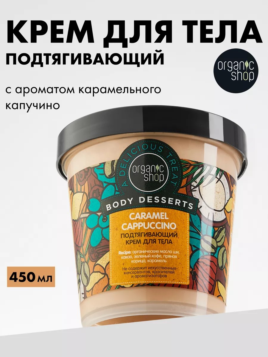 Подтягивающий крем для тела от целлюлита и отечности с ароматом карамельного капучино Боди десерт Caramel Cappuccino 450 мл — нежное ухаживающее средство для Вашей кожи с супер фудом в составе. Натуральные масла семян арабики и зеленого кофе, ши (карите), экстракт корицы и протеин обеспечивают интенсивное питание, увлажнение и упругость.