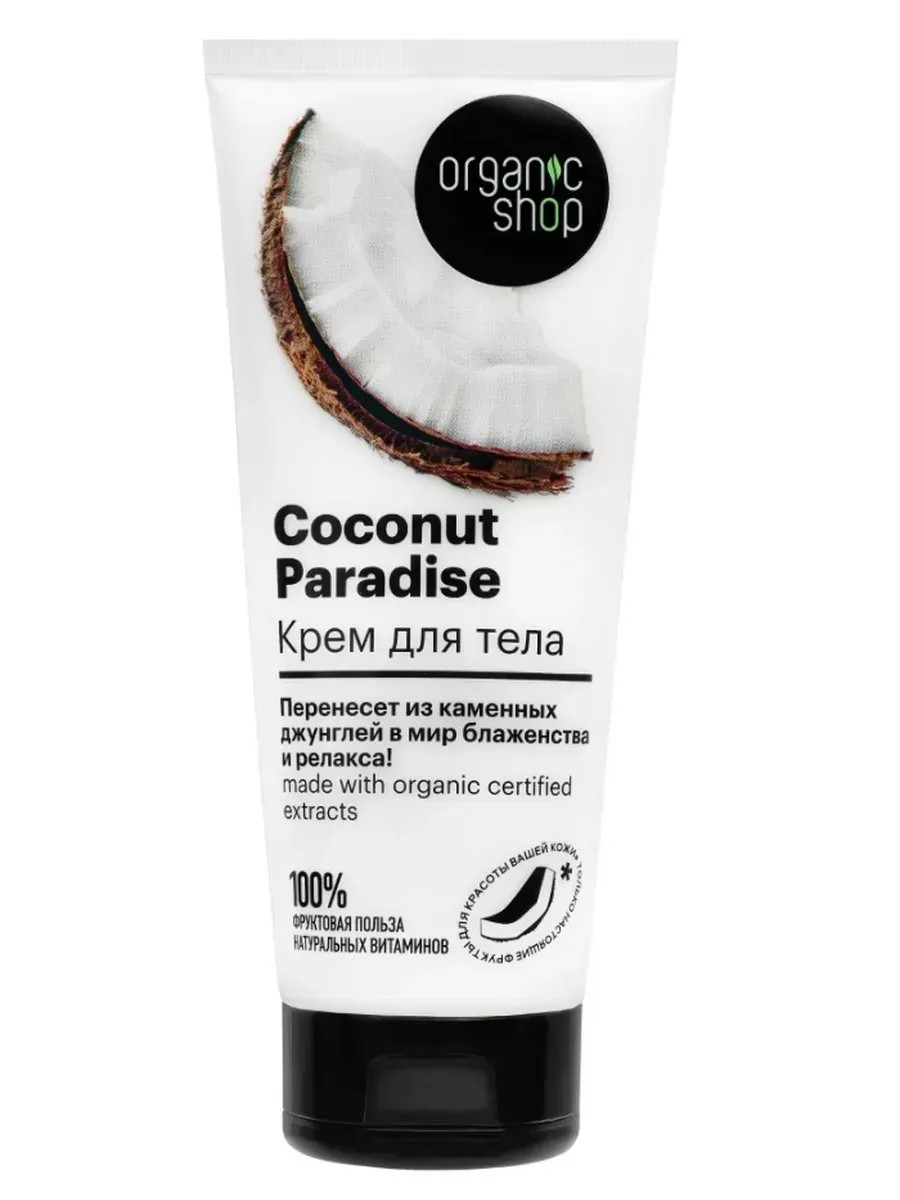 Для максимально нежного ухода за кожей, интенсивного увлажнения, насыщения питательными веществами, существенного улучшения ее состояния и получения длительного ощущения комфорта в лаборатории косметической марки Organic Shop разработали крем для тела Кокосовый рай. Высокая эффективность продукта заключается в использовании для его изготовления высококачественных ценных и полезных компонентов натурального происхождения, которые наилучшим образом влияют на кожу, обеспечивая надлежащий уход за ней. Уникальная формула крема обогащена натуральными фруктовыми экстрактами и маслами, превосходно питающими и увлажняющими кожу тела. Средство также обладает невероятно нежным и приятным ароматом, которым пропитывается кожа. Позвольте вашей коже впитать натуральные увлажняющие экстракты фруктов, вы почувствуете, что она стала гладкой и необыкновенно мягко.