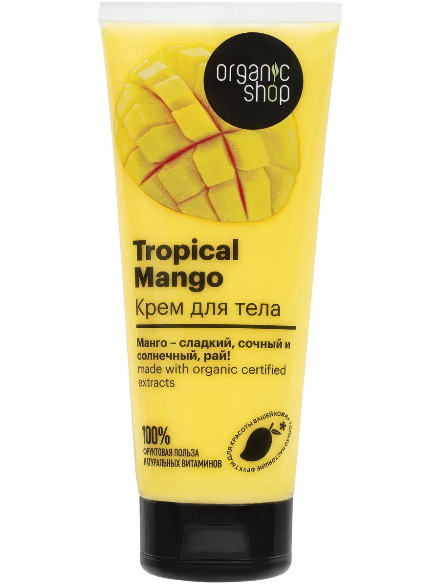Organic Shop Home Made Tropical Mango Body Cream, 200 ml. Tropical Mango Body Cream ATTENTION: Our products are so fruity, juicy, and deliciously aromatic that you might want to eat them :) Don't do that, it's body cream. Really! Mango is sweet, juicy, and sunny, paradise in a bottle! Ingredients: Aqua with infusions of Organic Mangifera Indica Fruit Extract (organic mango extract), Organic Passiflora Incarnata Extract (organic passion fruit extract), Organic Ananas Sativus Fruit Extract (organic pineapple extract); Cetearyl Alcohol (a natural thickener based on coconut oil), Glyceryl Monostearate, Glycerin, Stearic acid, Isopropyl palmitate, Helianthus Annuus Seed Oil, Sodium Cetearyl Sulfate, Xanthan Gum, Benzyl Alcohol, Ethylhexylglycerin, Sodium Hydroxide, Sodium Carbomer, Parfum, CI 15985, CI 19140. Apply to clean, dry skin with light massaging movements.