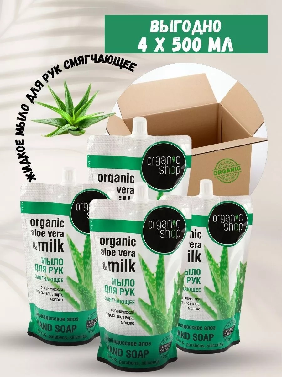 Смягчающее жидкое мыло «Барбадосское алоэ» от Organic Shop на основе органического экстракта алоэ вера и молока восстанавливает и увлажняет кожу, насыщает питательными веществами, успокаивает ее, придавая ощущение невероятной мягкости, нежности и чистоты. Мягко и бережно очищает, смягчает и поддерживает естественный баланс кожи, предотвращает появление сухости и трещин. Крем-мыло не содержит парабенов, силиконов, продуктов нефтехимии. Жидкое мыло для рук - это парфюмированный продукт, созданный для ежедневного применения и предназначенный для ухода за руками и телом всей семьи. Питает кожу, приятно пенится и легко смывается водой. Мыло с высоким индексом натуральности содержит увлажняющие компоненты предотвращающие появление сухости и трещин. Богатый и нежный аромат окутывает вас свежестью и делает процесс очищения еще более приятным и расслабляющим. Для создания этого мыла были использованы только лучшие ингредиенты растительного происхождения. Оно не только увлажняет и смягчает дерму рук, делая ее нежной и бархатистой, но и оказывает антиоксидантное воздействие, защищая кожу от свободных радикалов. Кроме того стимулирует клеточную профилетацию, что способствует разглаживанию морщин и придает коже молодой и здоровый вид. Имеет антибактериальные свойства и обеспечивает глубокое очищение кожи, удаляя накопленные несовершенства и борясь с бактериями. Практичный дой пак обеспечивает комфортное использование. Из-за своих уходовых свойств, это косметическое средство также идеально подходит для использования в бане, сауне, ванне или душе.