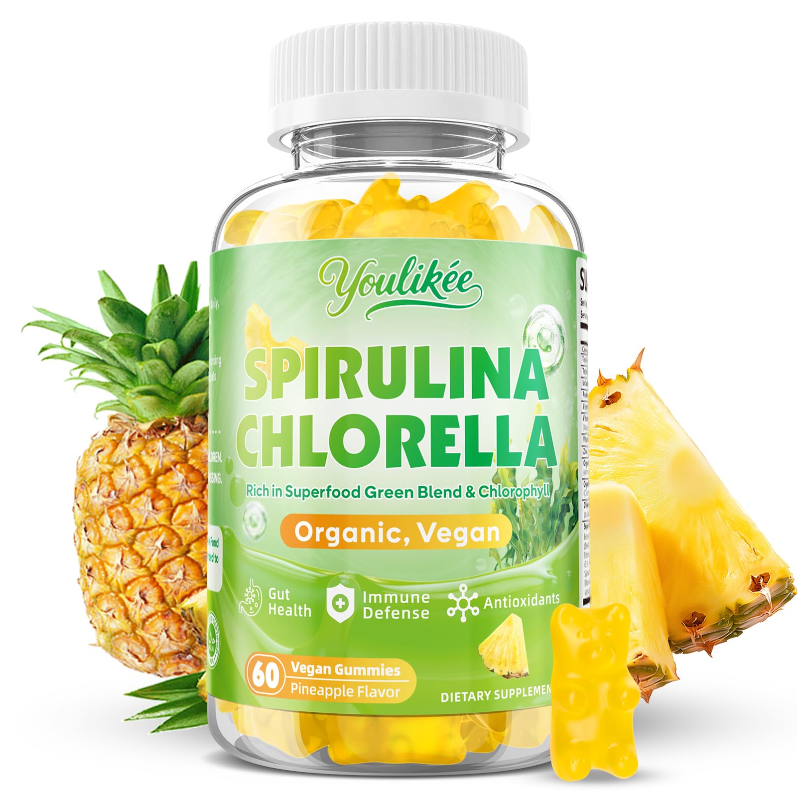 High-quality: Crafted in GMP facilities, bottled and third-party tested for safety, purity and quality. Plant-based sweetened with stevia, plus non-GMO, vegan, gluten-free, dairy-free and sugar-free—each chew has clean nutrition and great taste. Sugar-Free Convenient: Delicious pineapple treats—no powders! Skip hard-to-swallow Spirulina Chlorella pills, powders or capsules. These spirulina supplement gummies are soft and tasty. Chew, savor and enjoy superfoods hassle-free. Energy, Antioxidants Cell Support: More than a supplement—this is your daily boost. Spirulina and Chlorella deliver energy-supporting nutrients, antioxidants and cell care. We've added Vitamin C, D3 and Zinc to support immunity, plus Methyl B12 for energy and focus. Supergreens for Your Day: These gummies go beyond Spirulina and Chlorella—they include a Supergreen blend: Broccoli, Moringa, Wheatgrass, Spinach, Kale, Alfalfa Blueberry Extracts. Rich in antioxidants, vitamins and minerals, these greens nourish from the inside out. They support immunity and vitality, making them your daily boost. Nature's Superfoods: Nourish your body with pure, nutrient-dense goodness—our Spirulina Chlorella Gummies mix these two superfoods in a 1:1 ratio.Spirulina delivers plant-based protein, antioxidants and B-vitamins for energy Chlorella supports detox and digestion. Together, they fuel your body and boost overall wellness.