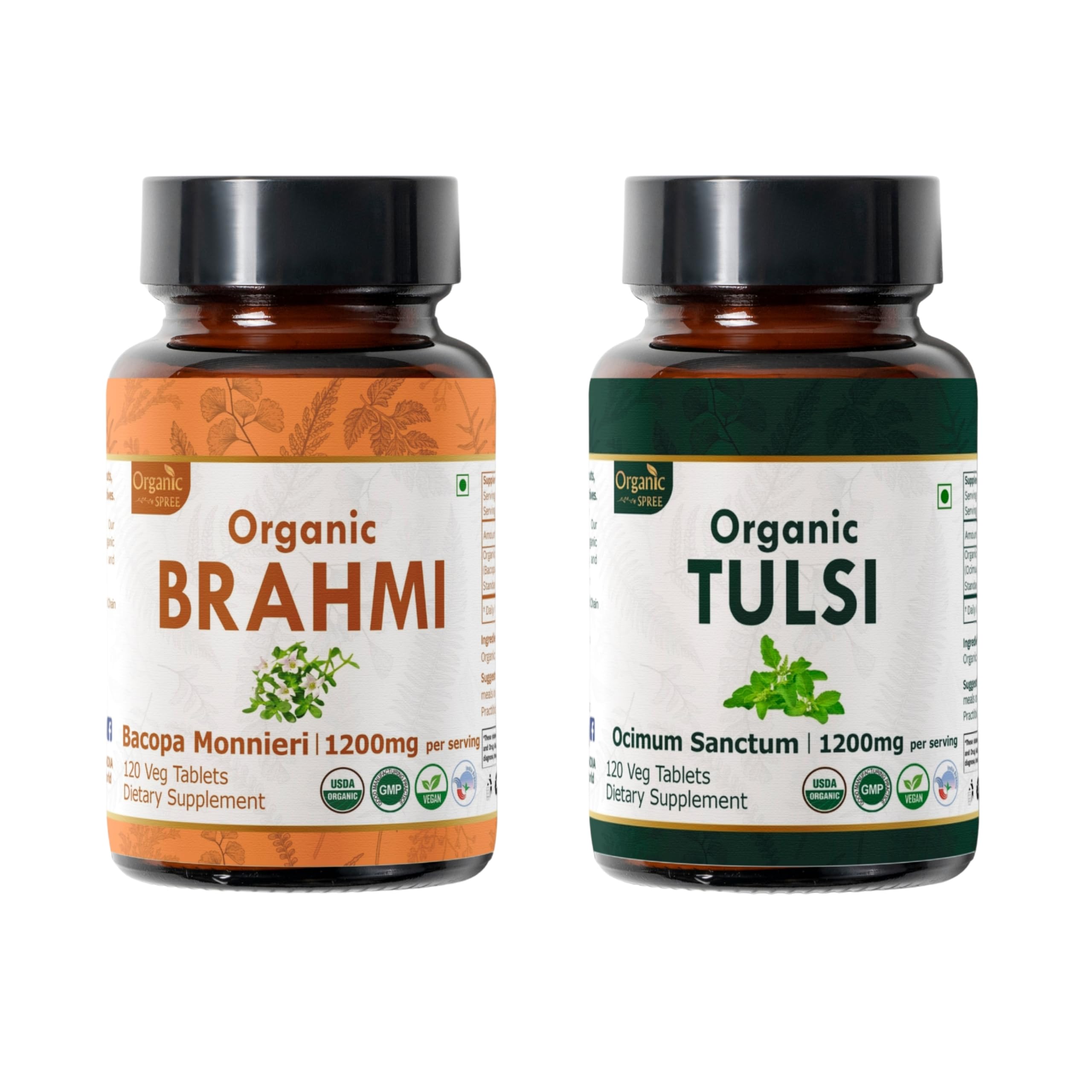 ORGANIC SPREE Brahmi & Tulsi Supplement 120 Tablets Each USDA Organic Bacopa Monnieri & Holy Basil
