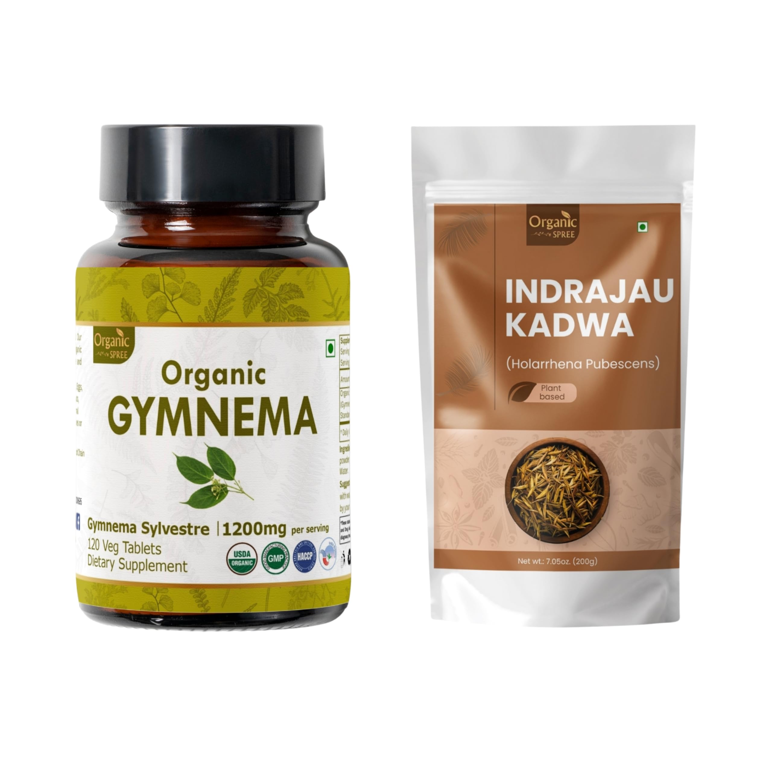 ORGANIC SPREE Gymnema & Indrajau Kadwa USDA Organic Gymnema Sylvestre 120 Tablets & Holarrhena Pubescens 200g