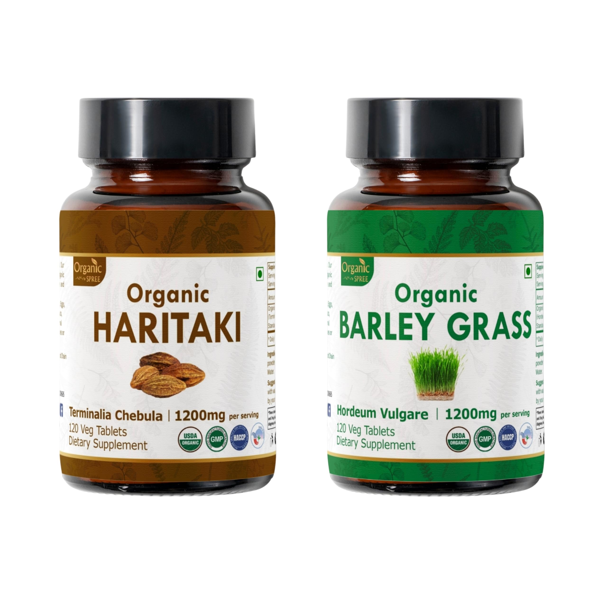 ORGANIC SPREE Haritaki & Barley Grass Supplement USDA Organic Terminalia Chebula & Hordeum Vulgare 120 Tablets Each