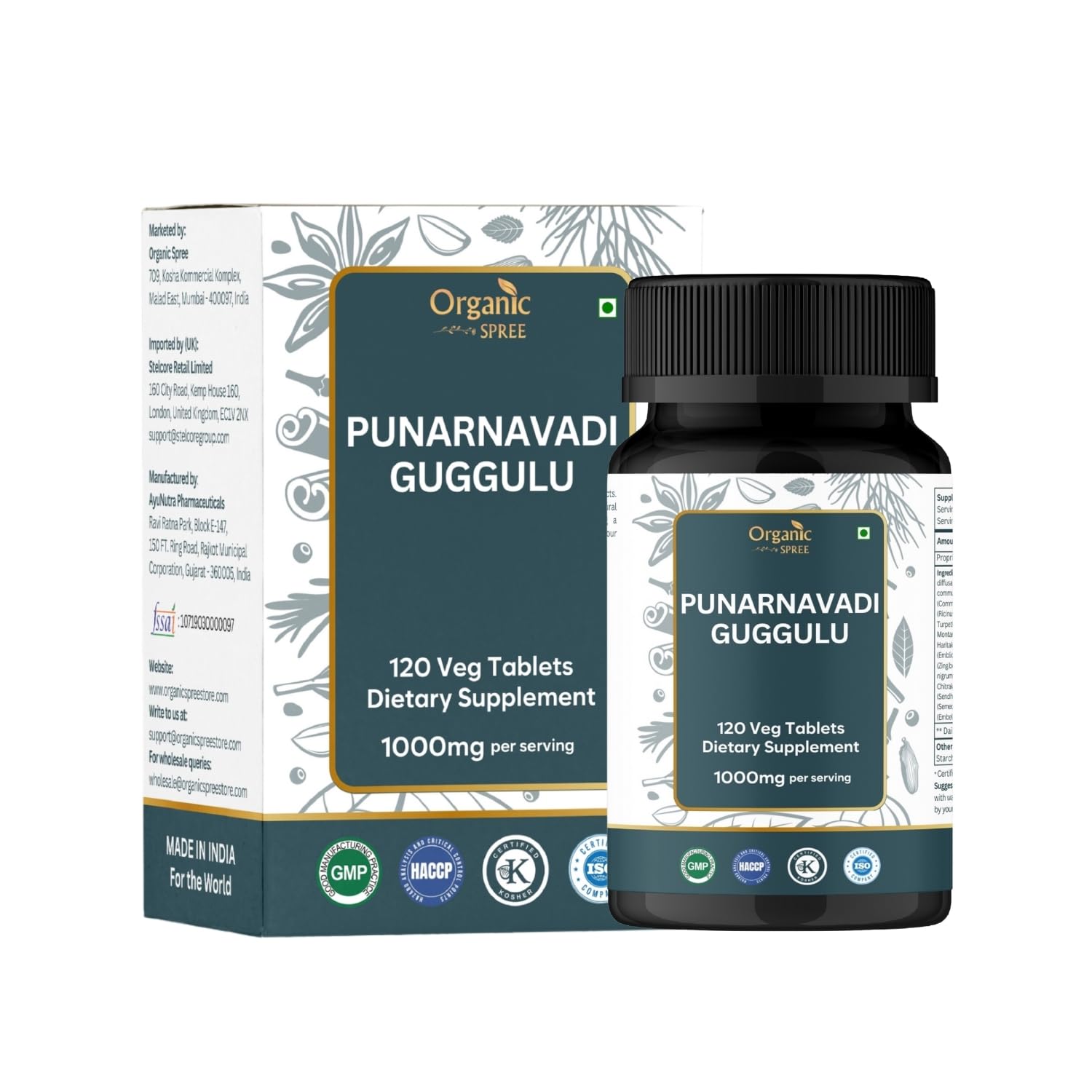 Store in a cool, dry place away from direct sunlight and moisture to preserve product quality and shelf life. Made in a GMP-certified facility, these vegetarian tablets comply with ISO, HACCP, and Kosher standards. Each batch undergoes strict testing to ensure safety, purity, and consistent potency. Punarnavadi Guggulu is known in Ayurveda for its ability to support kidney function and promote joint comfort. With Punarnava as the primary herb, it may help in managing water retention and supporting the overall urinary system. . Experience the traditional wisdom of Ayurveda with Organic Spree's Punarnavadi Guggulu Tablets. This time-honored herbal formulation is carefully crafted using classical Ayurvedic texts and clean manufacturing processes.