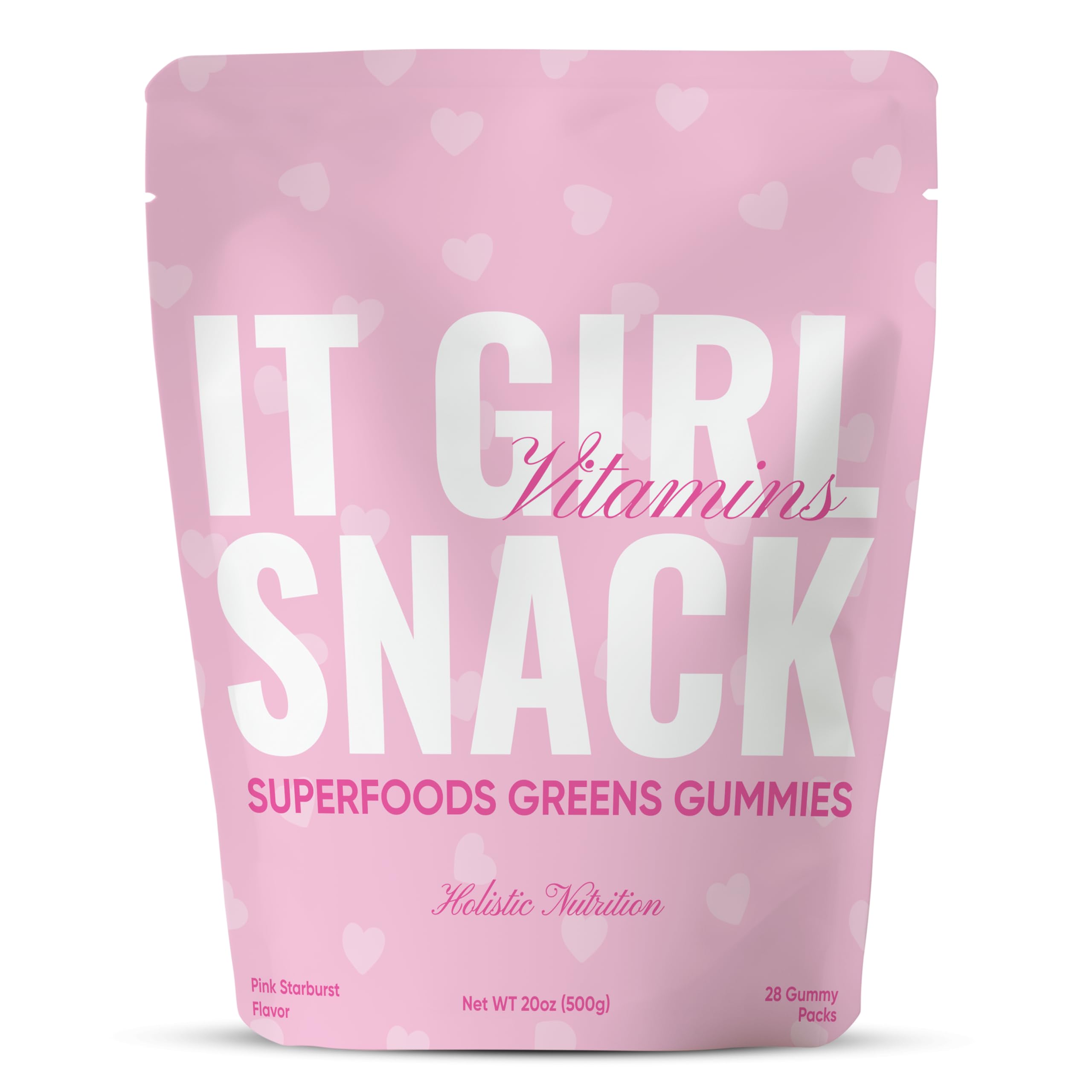 LOW-SUGAR SUPERFOOD GREENS GUMMIES FOR THE WHOLE FAMILY Packed with 60 fruits, vegetables, supergreens, adaptogens, prebiotics, and 20 essential vitamins and minerals including spirulina and chlorella. Supports digestion, immunity, energy, and beauty while tasting like candy. A healthy fruit and veggie supplement that doubles as a delicious daily snack for women, teens, and kids. NO MESS. NO STRESS. JUST PINK STARBURST JOY Each individual pack contains delicious pink heart-shaped gummies so there is no measuring, no mixing, and no supplement overwhelm. A truly portable superfood snack you can enjoy anytime, anywhere. Perfect for school, work, travel, and busy days. PREGNANCY-SAFE, MOM-APPROVED NOURISHMENT Thoughtfully formulated with essential nutrients including folate, iron, and Vitamin B12 alongside organic superfoods to support energy, glow, and wellness during pregnancy. A clean, gentle snack option for moms who want nourishment without artificial ingredients. PREMIUM ORGANIC QUALITY WITH ZERO COMPROMISES 100 percent plant-based and vegan. USDA Organic, Non-GMO Project Verified, Kosher Certified, Halal Certified, gluten-free, dairy-free, soy-free, nut-free, and made with no artificial colors, flavors, or preservatives. Naturally low sugar. Manufactured in FDA-registered, cGMP-certified facilities with 100 percent HDPE recyclable packaging. FORMULATED FOR REAL LIFE, BUSY GIRLS, AND TEENS Wellness should be simple. These gummies are made from 60 nutrient-dense whole-food ingredients so you can get complete daily nutrition in a form that fits your lifestyle. No chalky powders. No swallowing pills. Just a clean, delicious snack that makes healthy habits easy and sustainable. THE FIRST BEAUTY-FOCUSED GREENS GUMMY Designed for inner wellness and outer glow. Formulated with antioxidant-rich superfoods and plant-based nutrients that help combat oxidative stress and support clear skin, stronger hair, healthier nails, and youthful radiance. Beauty nutrition that starts in the gut and shows on the outside. HIGH-FIBER GREENS GUMMIES FOR REAL GUT SUPPORT Over 95 percent of people do not get enough fiber. It Girl Snack delivers 6g of soluble fiber plus 6x more gut-supporting ingredients than leading greens powders. Soluble fiber helps slow digestion, reduce bloating, support fullness, and promote balanced blood sugar. More fiber plus more vitamins using all-organic whole-food ingredients. ALL-IN-ONE BENEFITS WITHOUT THE SUPPLEMENT OVERLOAD One simple snack supports what normally takes a cabinet full of supplements. Supports gut balance, digestion, reduced bloat, immunity, focus, energy, stress support, metabolism, skin glow, hair and nail strength, healthy aging, recovery, hormone balance, sleep quality, and overall well-being. This is foundational nutrition made fun, delicious, and effortless. 10 INDIVIDUAL SNACK PACKS 30-DAY SUPERFOOD ROUTINE Includes 10 perfectly portioned snack packs for a full 30-day supply of organic greens, vitamins, minerals, and fiber. Powered by advanced liposomal Nanofuse delivery, this formula supports optimized absorption and steady nutrient release. No powders, no mess, no forgetting. Just grab a pack and glow. 70 total gummies crafted for consistency, purity, and everyday ease. A MULTIVITAMIN THAT ACTUALLY TASTES LIKE A SNACK It Girl Snack Superfood Greens Gummies are a next-generation methylated multivitamin made with 60 organic superfoods, fruits, veggies, fiber, adaptogens, prebiotics, and functional mushrooms. Each pink heart gummy tastes like a nostalgic pink strawberry starburst, turning daily nutrition into something you actually crave. Designed to support gut health, energy, immunity, beauty, focus, and overall wellness using bioavailable plant-based nutrients your body can absorb and use.