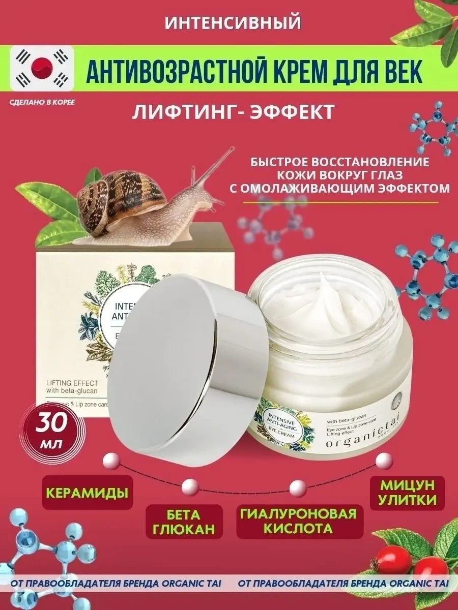 Органический корейский лифтинг крем вокруг глаз OrganicTai, крем для век, сглаживает мимические морщинки, быстро убирает отечность, темные круги, глубоко увлажняет и питает нежную кожу век. Уникальная формула с натуральным бета-глюканом, муцином улитки, керамидами, ниацинамидом, маслом сладкого миндаля и кокоса, гиалуроновая кислота, аллантоин, пантенол, витамин Е обеспечат увлажнение и питание. Уходовая косметика легко впитывается, придавая коже сияние, восстанавливает красоту и выравнивает цвет и рельеф. Действие ценнейших для кожного барьера керамидов, усилено комплексом жирных кислот из оливкового масла, что позволяет защитить нежную кожу век от потери жизненной влаги и образования морщин. Антивозрастной эффект обусловлен лецитином, экстрактами рапса и шиповника. Замедляет процессы старения, обеспечивает интенсивное омоложение, подтягивает, снимает уставший вид. Подходит как основа под макияж. Наносите небольшое количество крема вокруг глаз утром и вечером.