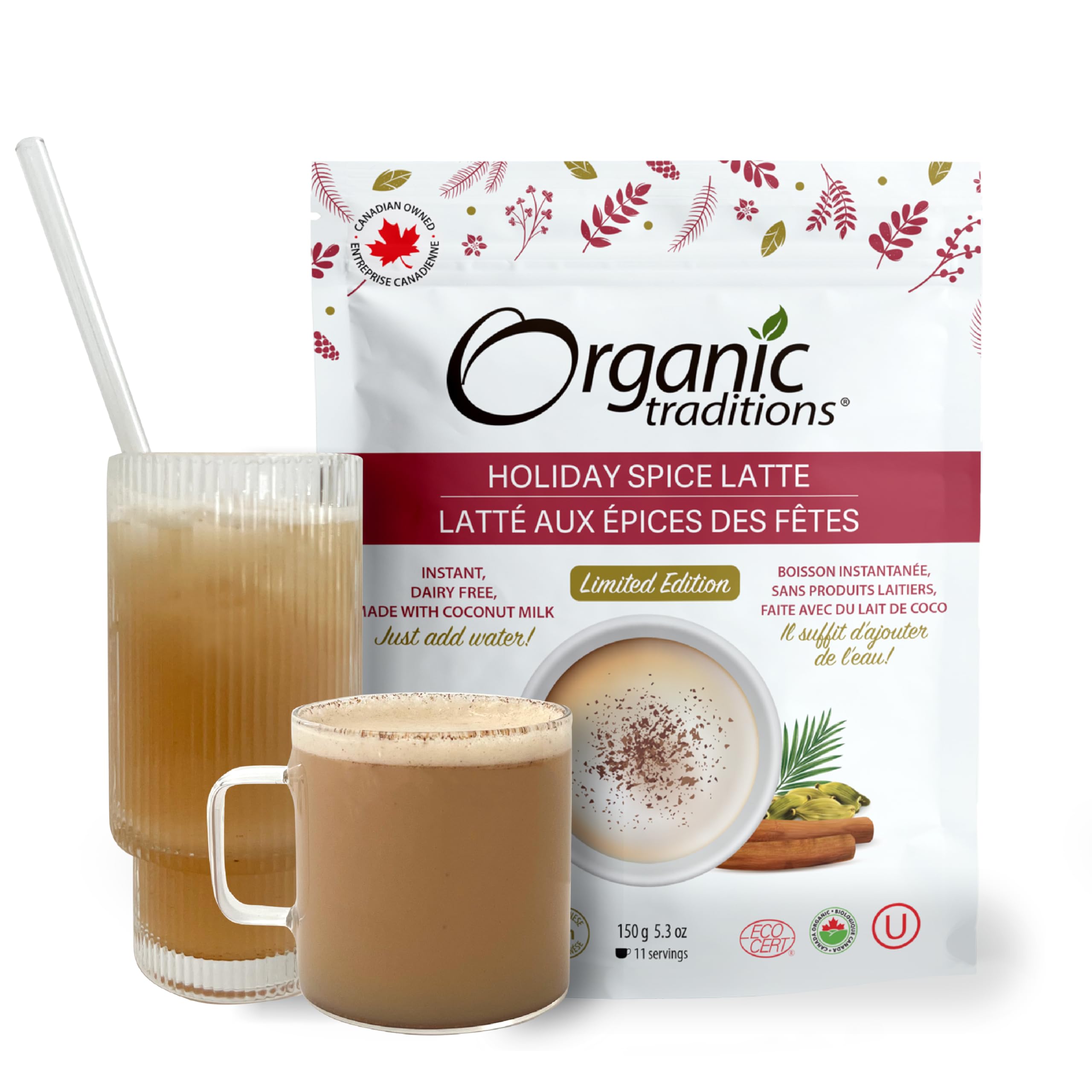Organic Traditions Holiday Spice Instant Latte Limited Edition Seasonal Flavour Superfood Caffeine Free Dairy Free Drink Mix for Hot and Iced Latte Drink 150g/5.3oz Bag