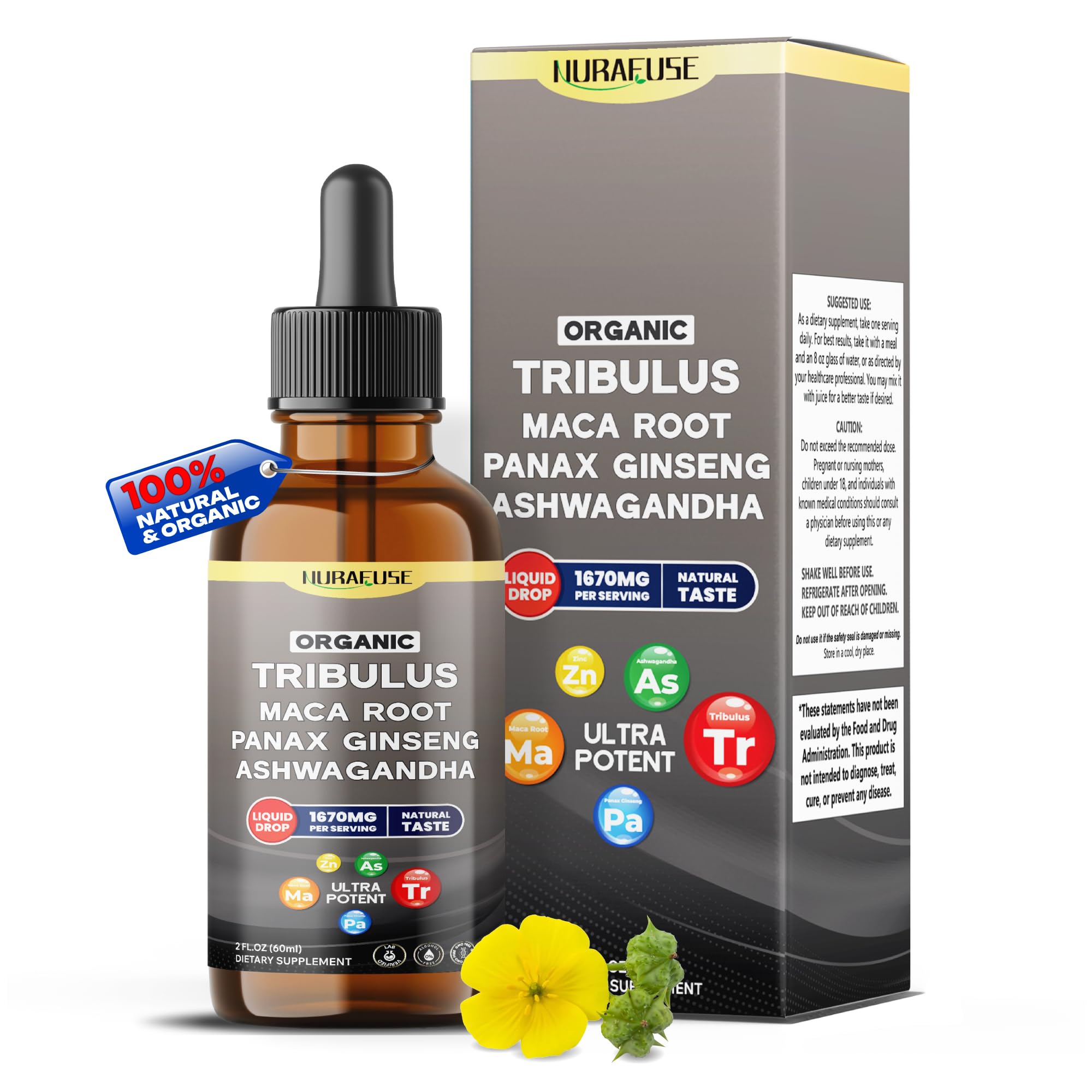 You can keep struggling with low stamina, slow recovery, and daily fatigue, or you can choose a natural, powerful solution – just 1ml of NuraFuse Liquid Tribulus each day. Imagine feeling stronger, more resilient, and ready to take on whatever the day throws at you. This ultra-potent blend delivers 1670mg per serving, including 1000mg of organic Tribulus, Maca Root, Panax Ginseng, and Ashwagandha – all known for supporting physical endurance, vitality, and overall energy. Plus, it includes a unique PerforEner(TM) support blend with Cordyceps, Sea Moss, and Nettle, enhancing your stamina and performance naturally. Enhanced with Black Pepper for better absorption, you get the most out of every drop. With a clean, natural taste, it’s easy to take directly or mix into your favorite drink – a simple, effective way to fuel your day.Your Daily Health Boost Made Easy: Whether you're looking to support your strength, or maintain steady energy, our mild-tasting liquid supplement fits seamlessly into your daily routine. Take it straight or add to your favorite drink, making wellness simple, every day. Premium Quality You Can Trust: Proudly made in the USA in a cGMP-certified facility, our liquid drops contain only high-quality, organic ingredients. No artificial additives, fillers, or preservatives – just pure, potent support for your wellness journey. Choose the best for your body. Fast, Efficient Absorption: Enhanced with Black Pepper for better nutrient uptake, this liquid formula ensures your body quickly absorbs the active ingredients, maximizing the impact of each drop. Feel the results sooner without the wait. Strength and Endurance Support: This blend of Tribulus, Panax Ginseng, and Maca Root is designed to support physical endurance, muscle strength, and overall vitality, helping you stay active, recover faster, and push through intense workouts with confidence. High-Potency Liquid Tribulus Formula: Feel the power of 1000 mg organic Tribulus per serving. Ideal for supporting stamina, vitality, and overall performance. Perfect for those looking to boost endurance, enhance physical performance, and stay active every day.