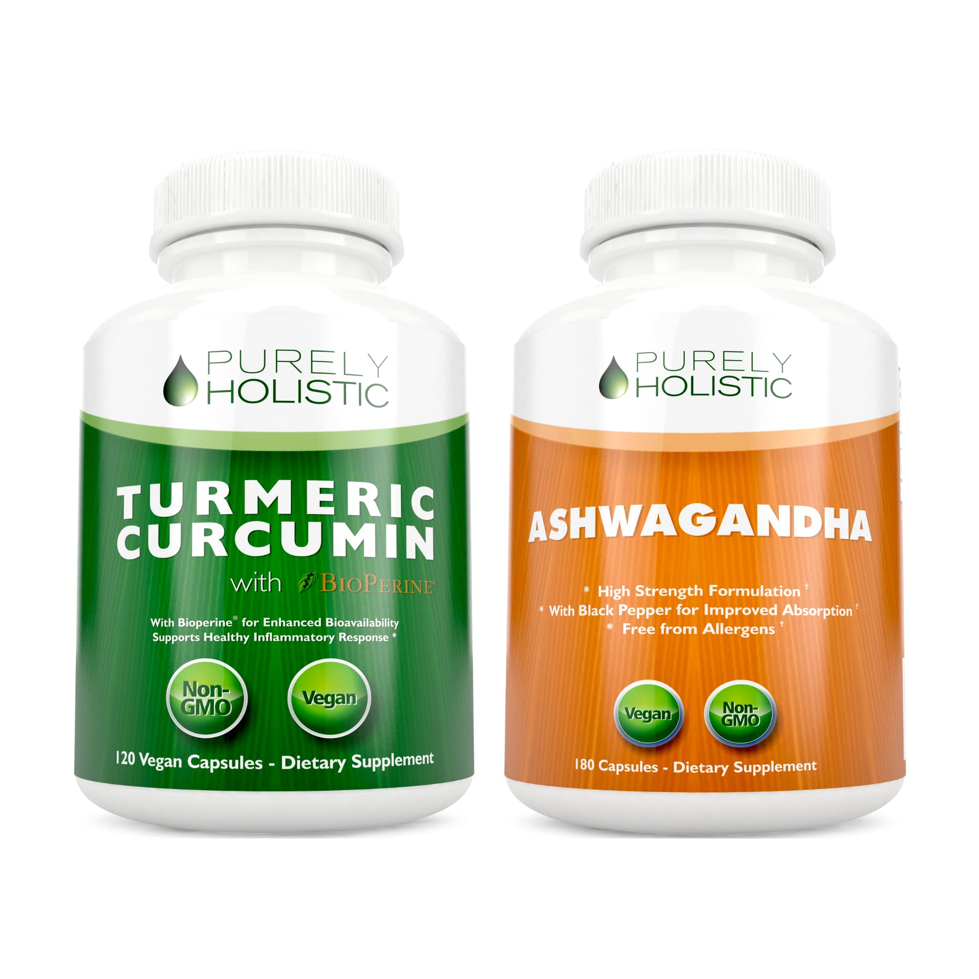 A powerful combination of Turmeric Curcumin supplement and Organic Ashwagandha. Purely Holistic's supplements pills have been formulated and manufactured at our own facility in the USA. All our supplements and vitamins are lab verified for potency and purity.