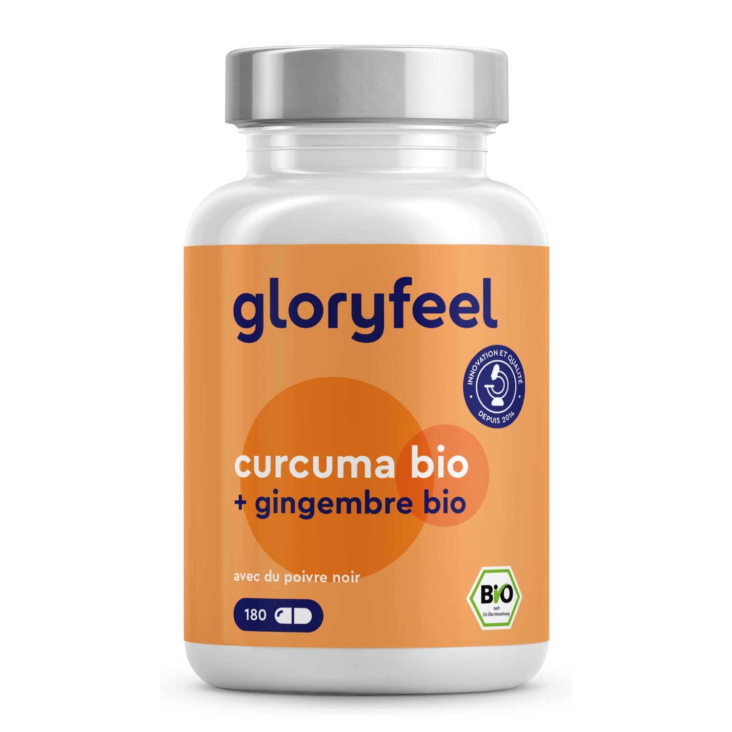 NEW QUALITY AND STABILITY STANDARDS - gloryfeel products are manufactured in Germany and undergo extensive stability testing to maintain consistent quality over a long period of time. Our commitment to exceeding industry standards underlines our leadership in quality assurance. Discover our Certificates of Analysis for greater transparency and confidence. Keep out of reach of children and not recommended for children under 6 years old. ✓ ORGANIC QUALITY FOR THE HIGHEST STANDARDS - Our products carry the organic label, which complements the EU organic logo and guarantees compliance with European organic farming legislation. This label confirms our commitment to organic production and species-appropriate husbandry, ensuring uniform standards and the highest organic quality. CURCUMIN WITH GINGER AND PIPERINE EXTRACT - Both turmeric and ginger are native to India and are well known in the culinary world. They have also been used for centuries in Chinese and Ayurvedic medicine. 180 HIGHLY BIOAVAILABLE CAPSULES - The recommended daily dose provides 3300 mg of pure turmeric, 1200 mg of organic ginger and 102 mg of black pepper, of which 5.1 mg is made from piperine. With organic and only natural ingredients, our capsules are suitable for all diets.NOUVELLES NORMES DE QUALITÉ ET DE STABILITÉ - Les produits gloryfeel sont fabriqués en Allemagne et sont soumis à des tests de stabilité approfondis afin de maintenir une qualité constante sur une longue période. Notre engagement à dépasser les normes de l'industrie souligne notre position de leader en matière d'assurance qualité. Découvrez nos certificats d'analyse pour plus de transparence et de confiance. Conservez hors de portée des enfants et déconseillé aux enfants de moins de 6 ans. ✓ QUALITÉ BIO POUR LES NORMES LES PLUS ÉLEVÉES - Nos produits portent le label biologique, qui s'ajoute au logo biologique de l'UE et garantit le respect de la législation européenne en matière d'agriculture biologique. Ce label confirme notre engagement en faveur de la production biologique et d'un élevage adapté aux espèces, garantissant des normes uniformes et la plus haute qualité biologique. CURCUMINE AVEC GINGEMBRE ET L'EXTRAIT DE PIPERINE - Le curcuma et le gingembre sont tous deux originaires de l'Inde et sont bien connus dans le monde culinaire. Ils sont également utilisés depuis des siècles dans les médecines chinoise et ayurvédique. 180 CAPSULES HAUTEMENT BIODISPONIBLE - La dose journalière recommandée apporte 3300 mg de curcuma pur, 1200 mg de gingembre bio et 102 mg de poivre noir, dont 5,1 mg est fabriqué à partir de pipérine. Avec des ingrédients biologiques et uniquement naturels, nos gélules conviennent à tous les régimes alimentaires.