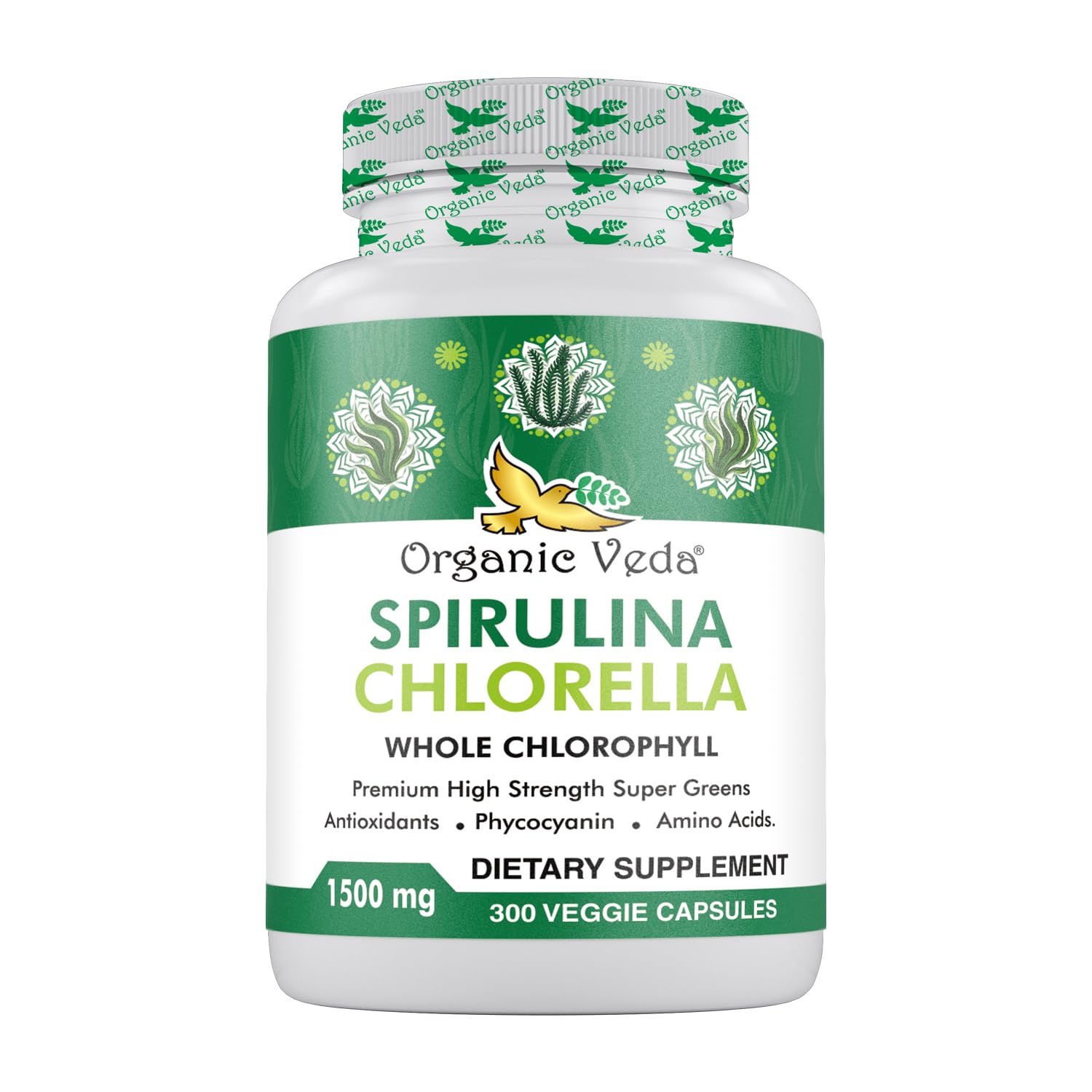 Organic Veda Spirulina & Chlorella Capsules 1500mg 300 Count - Spirulina Chlorella Capsules with Super Green Antioxidants Phycocyanin Amino Acid - Boost Immunity Energy Support Digestion