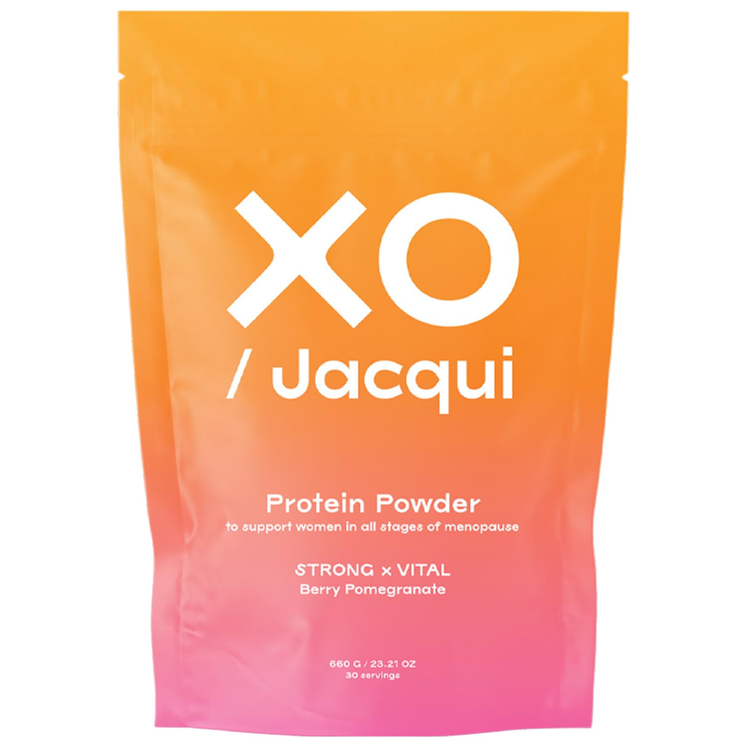 MADE FOR WOMEN BY WOMEN - XO Jacqui Menopause Support Protein Powder is made by women for women in Ojai, California. We provide a natural solution to help women stay strong, feel young, and be more energetic through every stage of menopause and beyond. DELICIOUS PROTEIN SUPPLEMENT - Savor the mouthwatering blend of berry and pomegranate in XO Jacqui's Berry Pomegranate Menopause Support Protein Powder. Just mix it into your favorite recipe or smoothie for a delicious protein boost. POWERED BY NATURE – Our 100 natural menopause support protein powder combines organic pomegranate powder, botanicals, vitamins, and minerals for vitality and strength. It's soy-free, gluten-free, GMO-free, estrogen-free, and refined sugar-free. OPTIMAL PROTEIN LEVELS - XO Jacqui's organic pomegranate berry protein powder offers 15g of protein per serving - perfect for muscle support during menopause. Combined with monk fruit, it also supports stabilized blood sugar and better digestion. MADE FOR MENOPAUSAL WOMEN - Stay youthful and energetic with our Berry Pomegranate Protein Powder. Its six-superfood blend of organic, science-backed ingredients supports immunity, combats bone loss, and promotes hormonal balance during menopause.