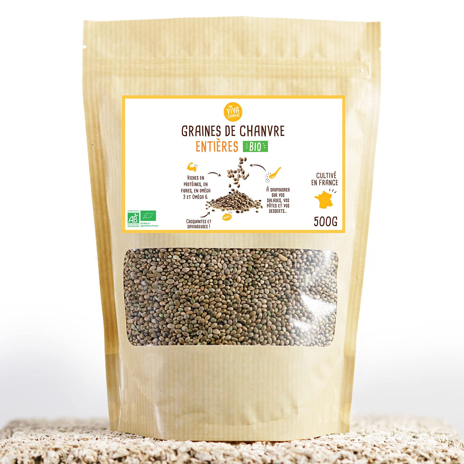 Hemp seed is one of the most nutritionally complete foods: Rich in essential Omega 3 and 6 fats in the perfect 1 3 ratio Rich in protein, perfectly assimilated by the body Source of minerals (iron, calcium, phosphorus, magnesium) Rich in dietary fiber and a delicious and original flavor One tablespoon of hemp seeds (20 g) meets the recommended daily requirement of essential fatty acids (1.5 g day according to the WHO)✓ Use without moderation! Add crunch and a new flavor to your sweet or savory recipes by sprinkling raw hemp seeds on them. GMO-free, lactose-free, gluten-free. Suitable for vegetarians and vegans. Grown in France and certified organic. ✓ Sprinkle on your salads, pasta and desserts. ✓ Rich in protein, fiber, omega 3 and omega 6. La graine de chanvre est l'un des aliments les plus complets au point de vue nutritionnel : Riche en gras essentiels Oméga 3 et 6 au rapport parfait 1 3 Riche en protéines, parfaitement assimilées par l'organisme Source de minéraux (fer, calcium, phosphore, magnésium) Riche en fibres alimentaires et une saveur délicieuse et originale Une cuillère à soupe de graines de chanvre (20 g) remplit les besoins journaliers recommandés en acides gras essentiels (1,5g j selon l'OMS)✓ A utiliser sans modération ! Apporter du croquant et une saveur nouvelle à vos recettes sucrées ou salées en y saupoudrant les graines de chanvre crues. ? Sans OGM, sans lactose, sans gluten. Convient aux végétariens et végétaliens. ? Cultivé en France et certifié Agriculture Biologique. ✓ A saupoudrer sur vos salades, vos pâtes et vos desserts. ✓ Riches en protéines, en fibres, en oméga 3 et oméga 6.