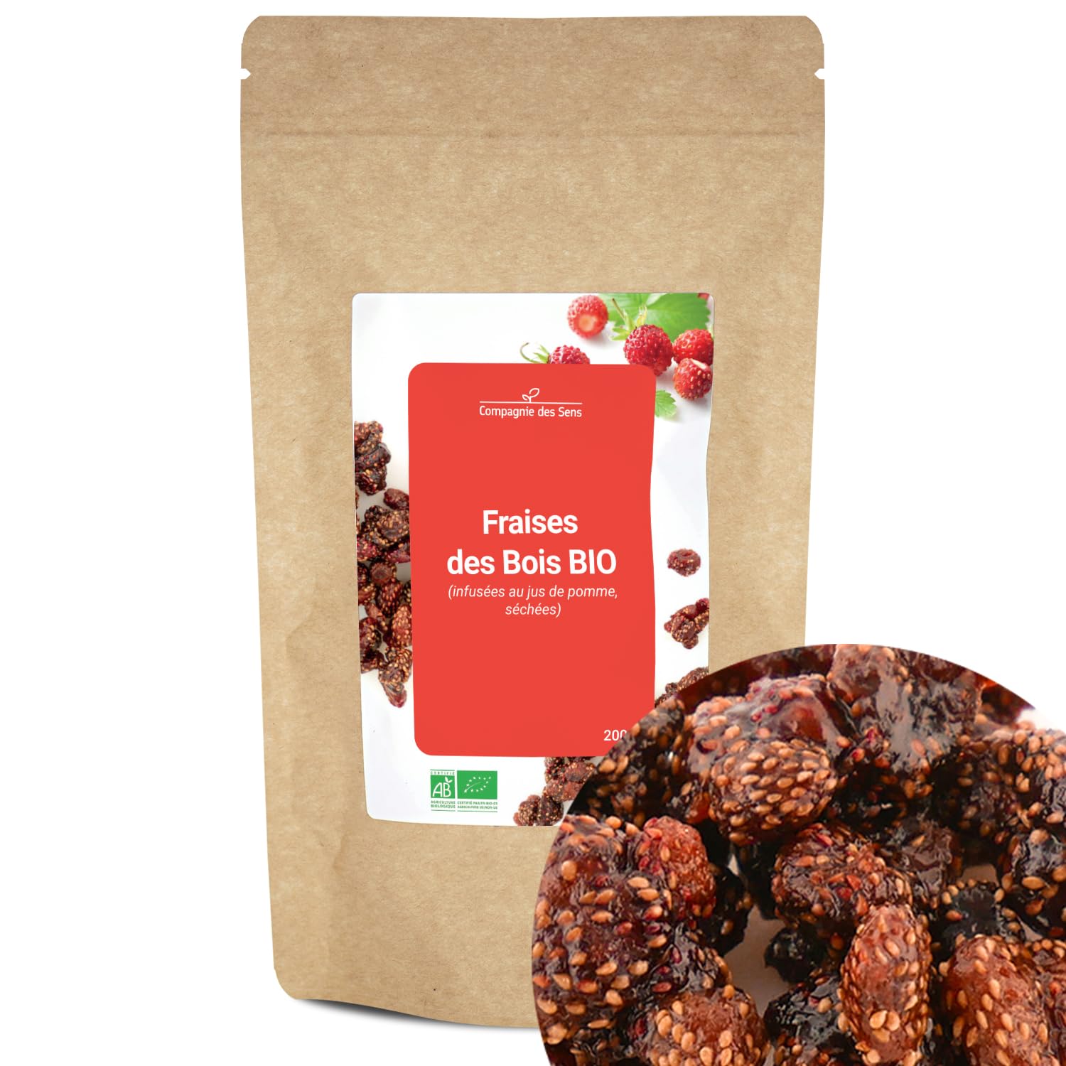 These dried wild strawberries, infused with apple juice, are certified organic by Ecocert (FR-BIO-01). They can be eaten as they are as a snack or mixed with other dried fruits, in desserts, muesli, dairy products or even in preparations both sweet (muffins, cakes.) and savory (salads, dishes,.). These strawberries are sold in an airtight bag to preserve all their benefits and use them easily on a daily basis. INGREDIENTS Wild wild strawberries 70 , concentrated apple juice, from organic farmingIngredients: Wild strawberries 70 , concentrated apple juice, from organic farming. Country of origin: Dinaric Alps. Close tightly after use, store away from heat and light. To be consumed as part of a varied, balanced diet and a healthy lifestyle. Certified organic by Ecocert (FR-BIO-01), guaranteed to be free of contaminants, heavy metals and pesticides. Latin name: Fragaria vesca L. Sold in: Resealable kraft bag, aluminum interior. Ces Fraises des bois sauvages, infusées au jus de pomme, séchées sont Certifiées BIO par Ecocert (FR-BIO-01). Elles peuvent être consommées telles quelles en en-cas ou mélangées avec d'autres fruits secs, dans des desserts, muesli, laitage ou encore dans des préparations aussi bien sucrées (muffins, cakes.) que salées (salades, plats,.). Ces Fraises sont vendues dans un sachet hermétique pour préserver tous leurs bienfaits et les utiliser facilement au quotidien. INGRÉDIENTS Fraises des bois sauvages 70 , jus de pomme concentré, issus de l'agriculture biologiqueIngrédients : Fraises des bois sauvages 70 , jus de pomme concentré, issus de l'agriculture biologique. Pays d'origine : Alpes Dinariques. Bien refermer après utilisation, à conserver à l'abri de la chaleur et de la lumière. À consommer dans le cadre d'un régime alimentaire varié, équilibré, et d'un mode de vie sain. Certifié BIO par Ecocert (FR-BIO-01), garanti sans contaminant, sans métaux lourds et sans pesticides. Nom Latin : Fragaria vesca L. Vendu en : Sachet kraft refermable, intérieur aluminium.