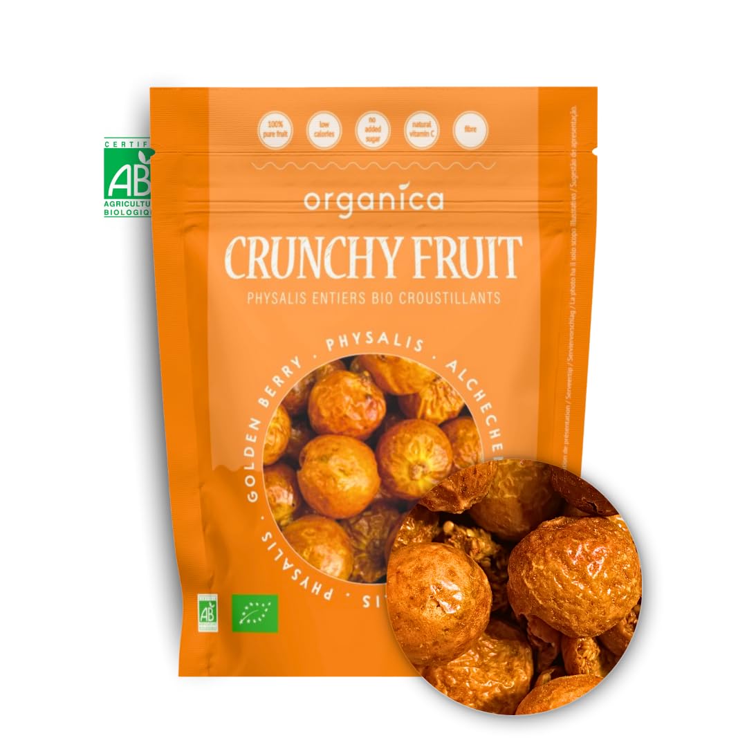 Organica Food reveals the tangy sweetness of physalis: whole organic physalis, freeze-dried for a tropical flavor and an ultra-crunchy texture. 100 fruit – no added sugar or preservatives ? Source of vitamin C fiber, only 42 kcal per bag 12g resealable bag: equivalent to 120g of fresh fruit Chip texture, ideal for snacking or as a gourmet topping French brand – packaged in a sheltered workshop (ESAT), FSC certified packaging WHY CHOOSE FREEZE DRYING? The process removes water under vacuum at low temperature: vitamins, orange color, and authentic taste remain intact, unlike traditional drying. Nutritional Information Per 100g Per 12g Energy 1470 kJ 350 kcal 176 kJ 42 kcal Fat (of which saturates) 3.0 g (0.3 g) 0.4 g ( 0.1 g) Carbohydrate (of which sugars) 78 g (68 g) 9.4 g (8.2 g) Fiber 11 g 1.3 g Protein 6 g 0.7 g Salt 0.01 g 0.01 g Quick Tip: Sprinkle these crunchy physalis pieces over coconut yogurt or blend them into a mango-banana smoothie for a tangy touch with no added sugar! INGREDIENTS Physalis 100 ( from organic farming)