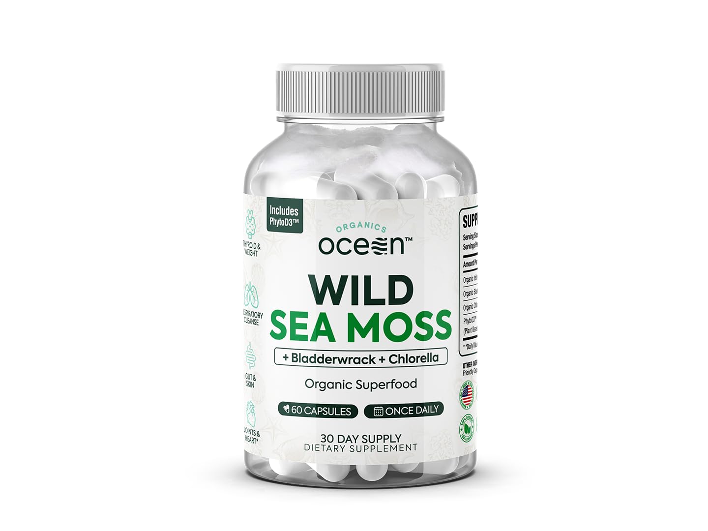 Exclusive Blend for Exceptional Health: Not all sea moss supplements are created equal. At Organics Ocean, our formula features a custom blend of powerhouse ingredients to help you see and feel more results in less time. It's our best sea moss formulation yet, and we will continue to source the highest-quality ingredients available because we always have your best interest at heart. Organically Sourced from the Atlantic Ocean: Wild-harvested sea moss is hard to come by as it's sourced from the colder waters of the Atlantic Ocean, so you can get more minerals with zero additives. We also closely monitor our supply chain to help ensure a superior quality Irish sea moss supplement with lower heavy metals. Powerhouse Thyroid and Lung Support Supplement: Each serving of our organic sea moss capsules is rich in iodine. This is a vital mineral in Organic Oceans' thyroid supplement for supporting optimal thyroid function. Plus, sea moss' mucilaginous properties can provide soothing support for clearer airways, so you can breathe easy and conquer the day, every day. Contains 92 Out of 102 Essential Minerals: Organic Wild Sea Moss is called "The Miracle of the Sea'' because it's a seaweed supplement packed with antioxidants and minerals. This multimineral sea moss contains 92 essential minerals to support your hydration and a balanced skin microbiome while boosting thyroid and lung health. Unmatched Organic Formulation: We combined wildcrafted sea moss with the organic antioxidant-rich superfoods chlorella and vitamin D3 to cover your daily energy support, detox, and immunity needs. Optimized with organic bladderwrack to rev up natural energy production and digestion to clear your body of unwanted gunk.