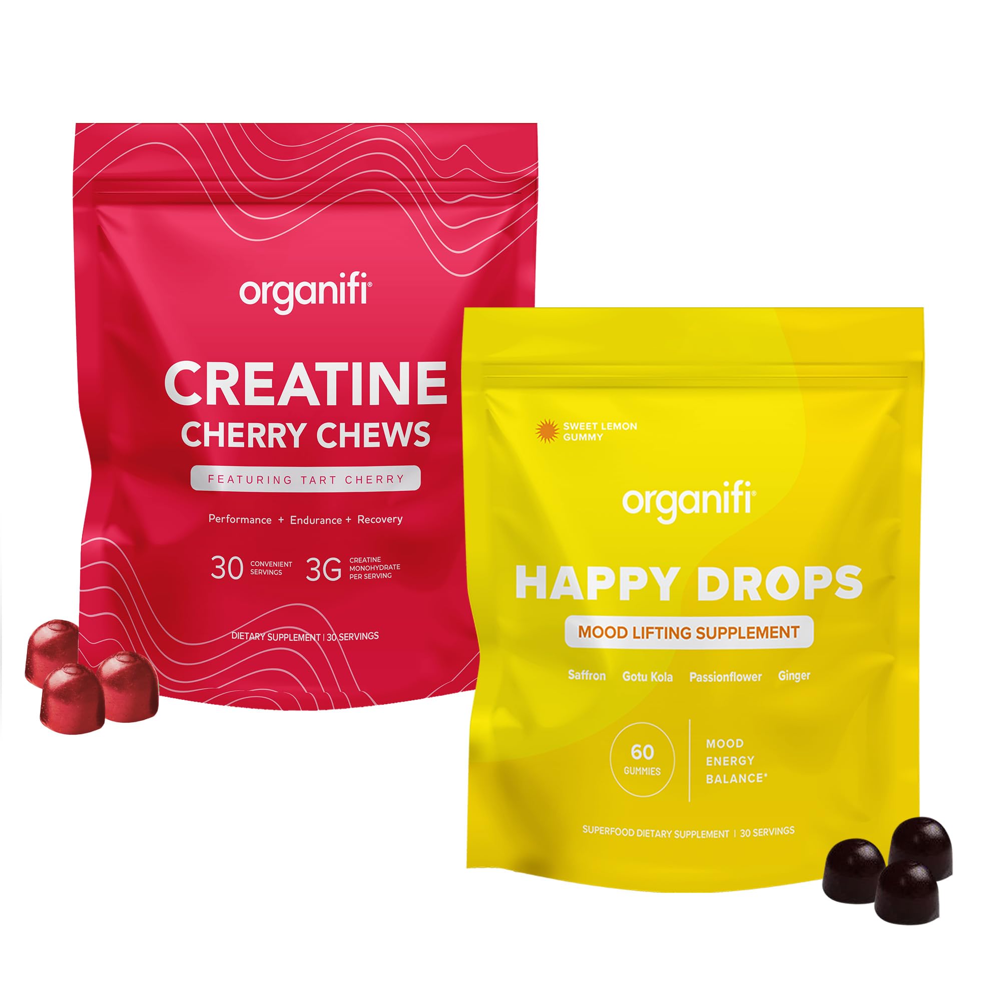 Contributing to the World We Live In: Organifi's top-quality blends are enjoyed across the globe. We started with a simple idea to make nutrition easy and delicious for everyone. This turned into a mission to unite the world through community, wholeness, and habit transformation. Directions: Take two delicious cherry gummies and two Happy Drops once daily, or as directed by your healthcare provider. It's always best to consult with your healthcare professional for a more personalized recommendation. Boost Your Mood and Your Muscles: Happy Drops help keep you balanced and upbeat, while our creatine supplement powers your strength, endurance, and recovery. Together, they support both mind and body so you can perform and feel your best every day. Your Daily Adaptogen Burst of Mood Support: Organifi Happy Drops are a delicious saffron supplement enriched with other superfoods to help you feel good. They're your delicious pick-me-up to help you rebalance and give you that much-needed lift anytime you feel the slump or are in the dumps. Premium Creatine Supplement for Strength and Recovery: Support muscle growth, strength, and energy with these delicious, real-food creatine gummies. Made with creatine monohydrate for women and men, they help enhance performance, boost endurance, and speed recovery between workouts.