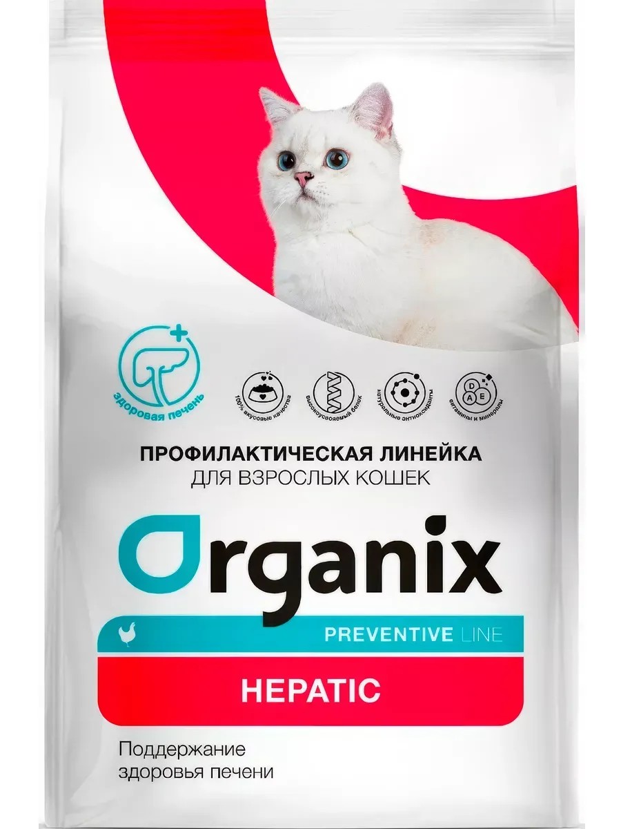 Organix Preventive Line Hepatic Cat Food for Liver Health, 600 g. Organix Preventive Line is a preventative line of cat and dog food that helps maintain your pet's health! Organix Preventive Line is suitable for feeding pets before they develop pathologies if they are prone to certain disorders, as well as during periods of remission to prevent exacerbations. Organix Hepatic is a complete, balanced dry cat food designed to prevent liver dysfunction in adult cats. An adapted amount of highly digestible proteins, fats, and carbohydrates support healthy liver function. Milk thistle has hepatoprotective (prevents the destruction of cell membranes and stimulates liver cell regeneration) and antioxidant properties. Dandelion root is a choleretic and antispasmodic. The increased choline content improves metabolic processes, and lecithin contains substances that participate in the formation of liver cells. The feed has a high palatability. Ingredients: dehydrated chicken meat 22%, rice, corn, barley, chicken fat (7%), fermented protein, natural flavor additive, vitamin and mineral complex, dehydrated whole eggs, beet pulp, fish oil, DL-methionine (7000 mg/kg), lecithin, fructooligosaccharides, cranberry extract, taurine (3000 mg/kg), milk thistle, barberry, dandelion root extract, Yucca schidigera extract (500 mg/kg), antioxidant. Nutritional value per 100 g: Protein 26% Fat 14% Fiber 4% Ash 4.5% Moisture 7% Calcium 0.55% Phosphorus 0.55% Magnesium 0.065% Sodium 0.7% Potassium 0.6% Copper 20 mg/kg Zinc 170 mg/kg Iron 90 mg/kg Iodine 2.5 mg/kg Carbohydrates 42% Vitamin A 22,000 IU/kg Vitamin D 1,500 IU/kg Vitamin E 350 mg/kg Omega-3 0.36% Omega-6 2.3% Energy value per 100 g: 376 kcal. Feeding recommendations: Transition from the previous diet gradually, in small portions over 5-7 days. Feeding recommendations may vary depending on the age, condition, activity and living conditions of the animal. Your pet should always have access to fresh drinking water. We recommend consulting a veterinarian before feeding! Pet weight, kg Daily intake, grams 2 28 3 36 4 44 5 51 6 57 7 64 7 64 + 7 g/1 kg of weight